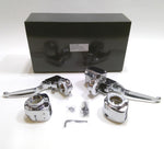 Handlebar control kit features a Show Chrome finish and has a 1/2 bore master cylinder and is for single front disc applications without Cruse control.