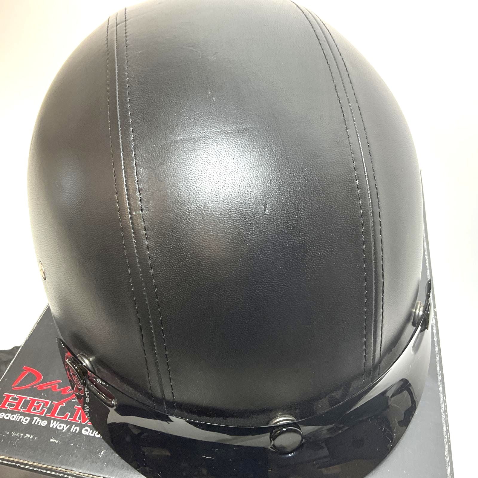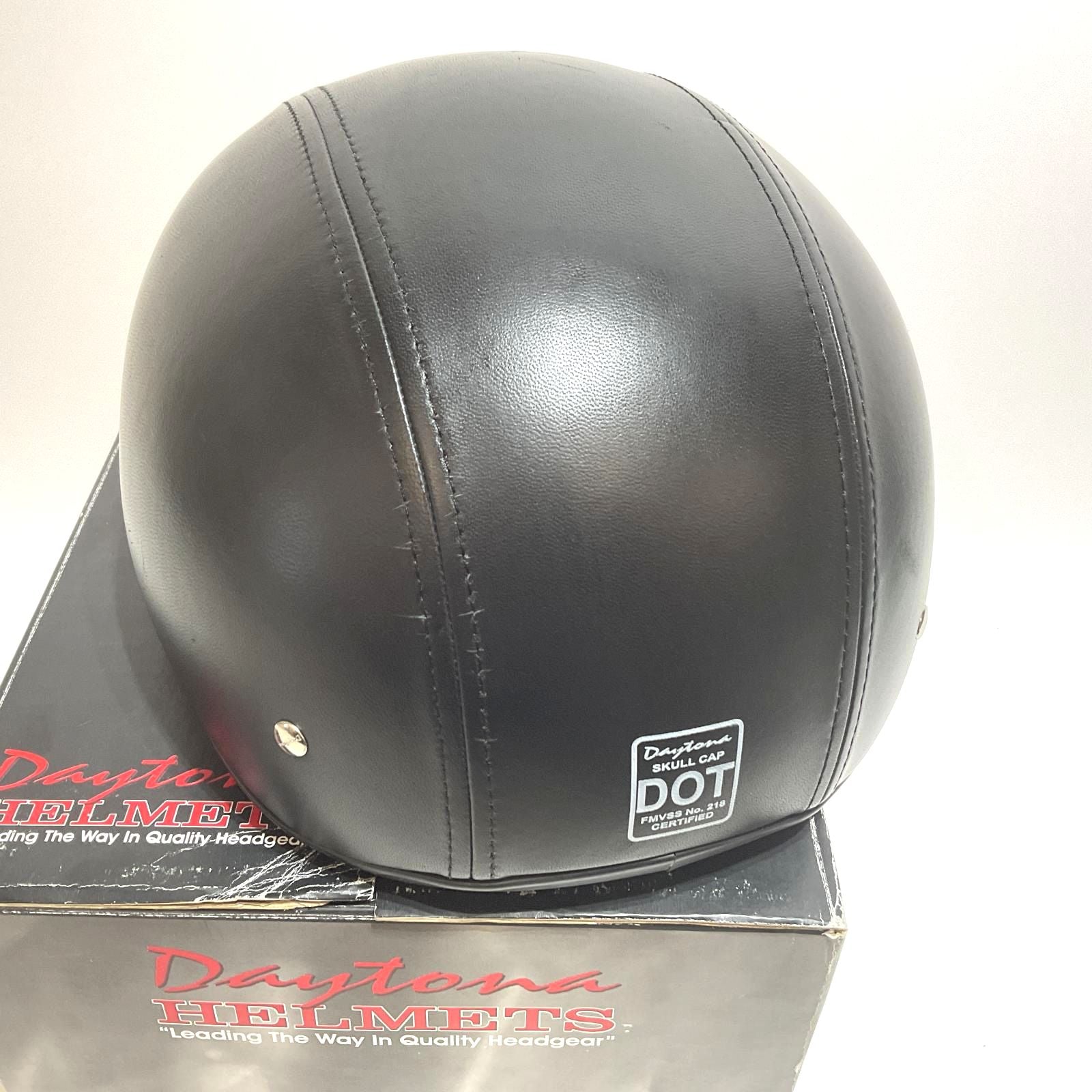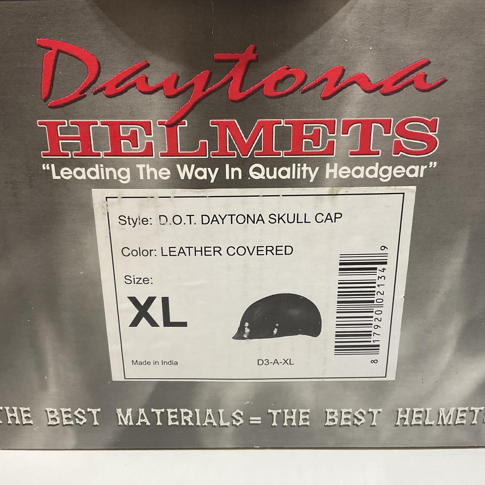 Our D.O.T. Daytona Slim Line Skull Cap 1/2 Shell Helmet In Leather, Meets And Exceeds D.O.T. FMVSS 218 Standards And Is The Smallest D.O.T. 1/2 Shell Helmet Ever Made!! With 3 Different Shell Sizes, You're Sure To Get That Proportionate Fit!! We Use The Finest Lamb Hide, Imported From New Zealand. Available With Or Without Removable, Snap On Gloss Black Mini Scoop Visor. Free Head Wrap And Cloth Draw String Bag Included.