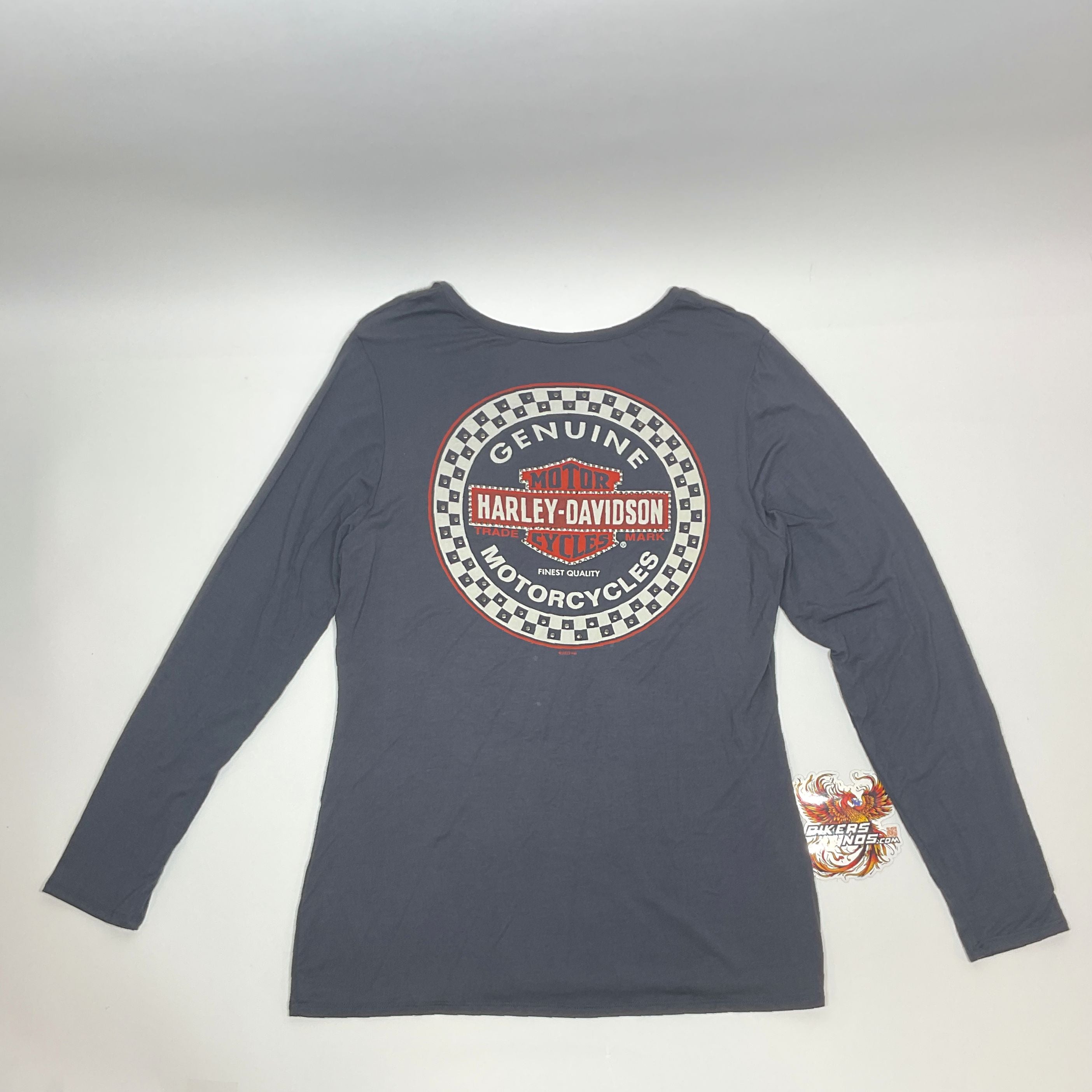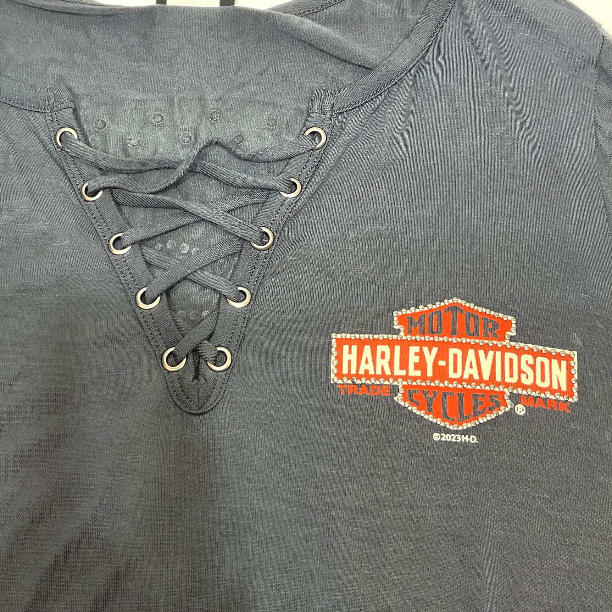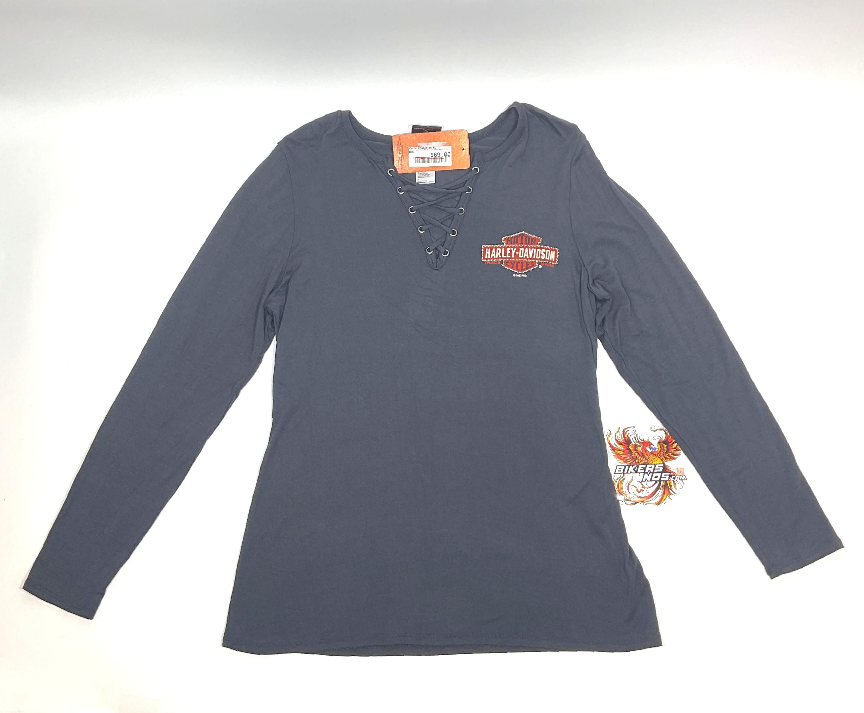 Awesome racing rhinestone embellished graphics on front and back. Soft and light-weight. Made from 95% rayon and 5% spandex. Attractive lace-up V-Neck. Solid Gray. Made in the USA.