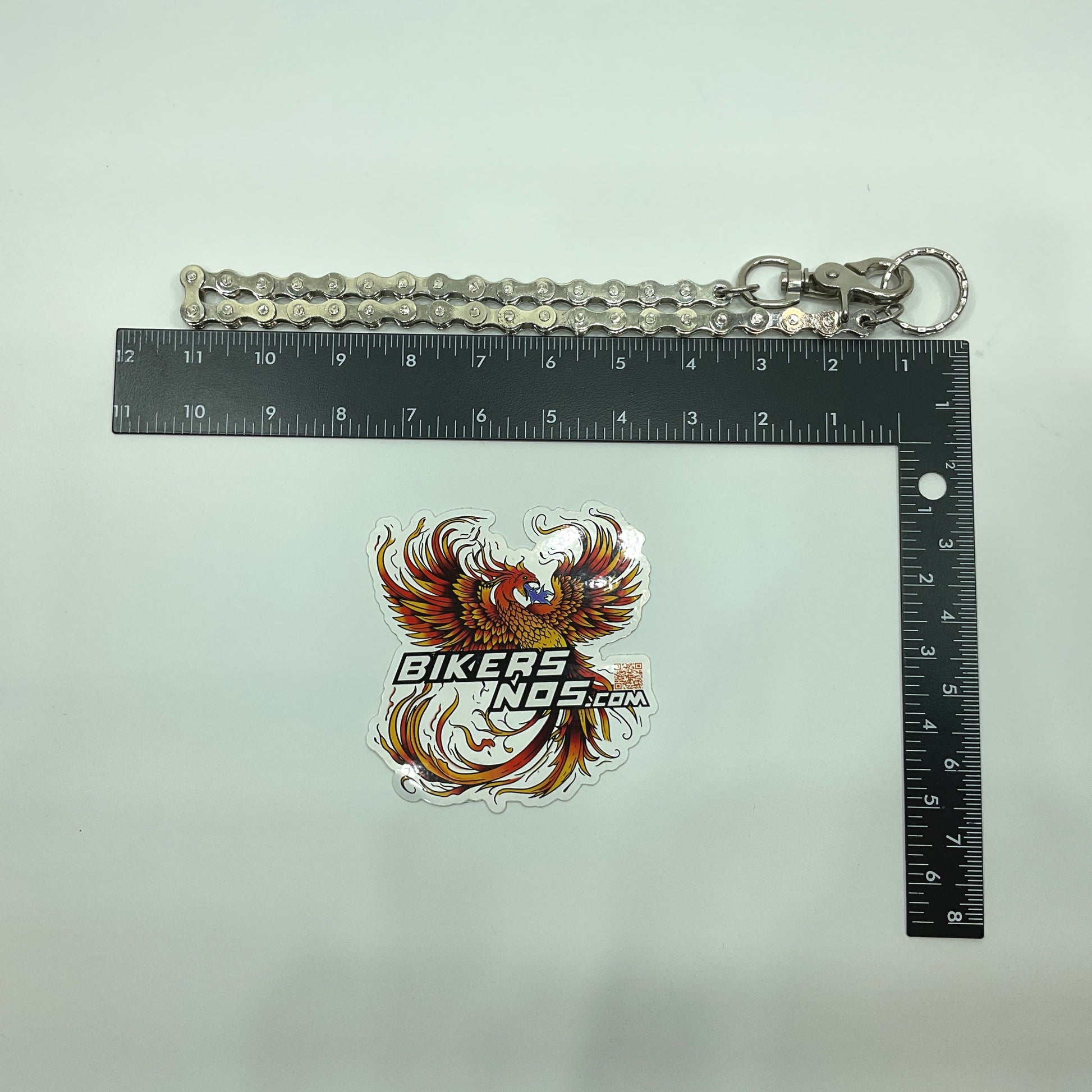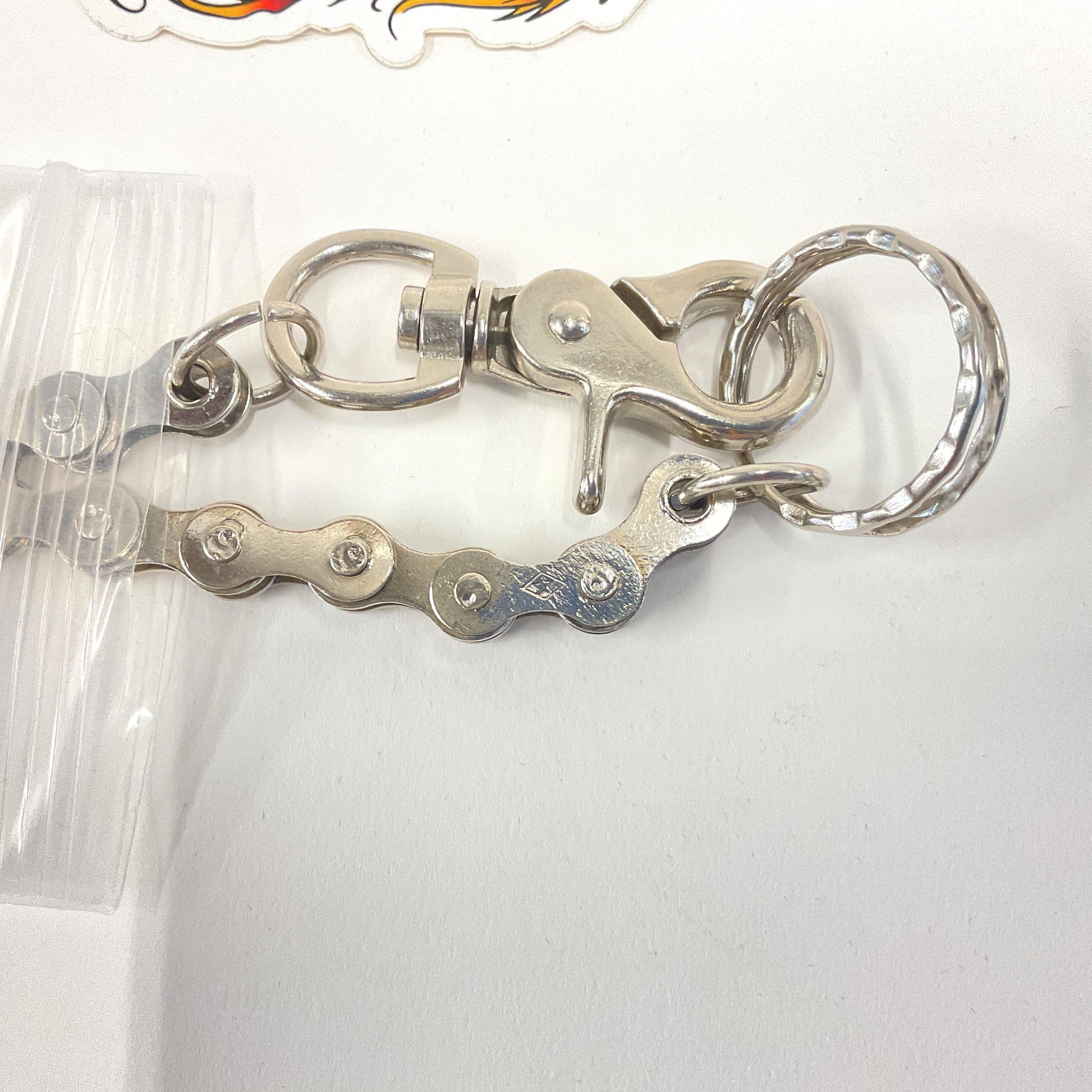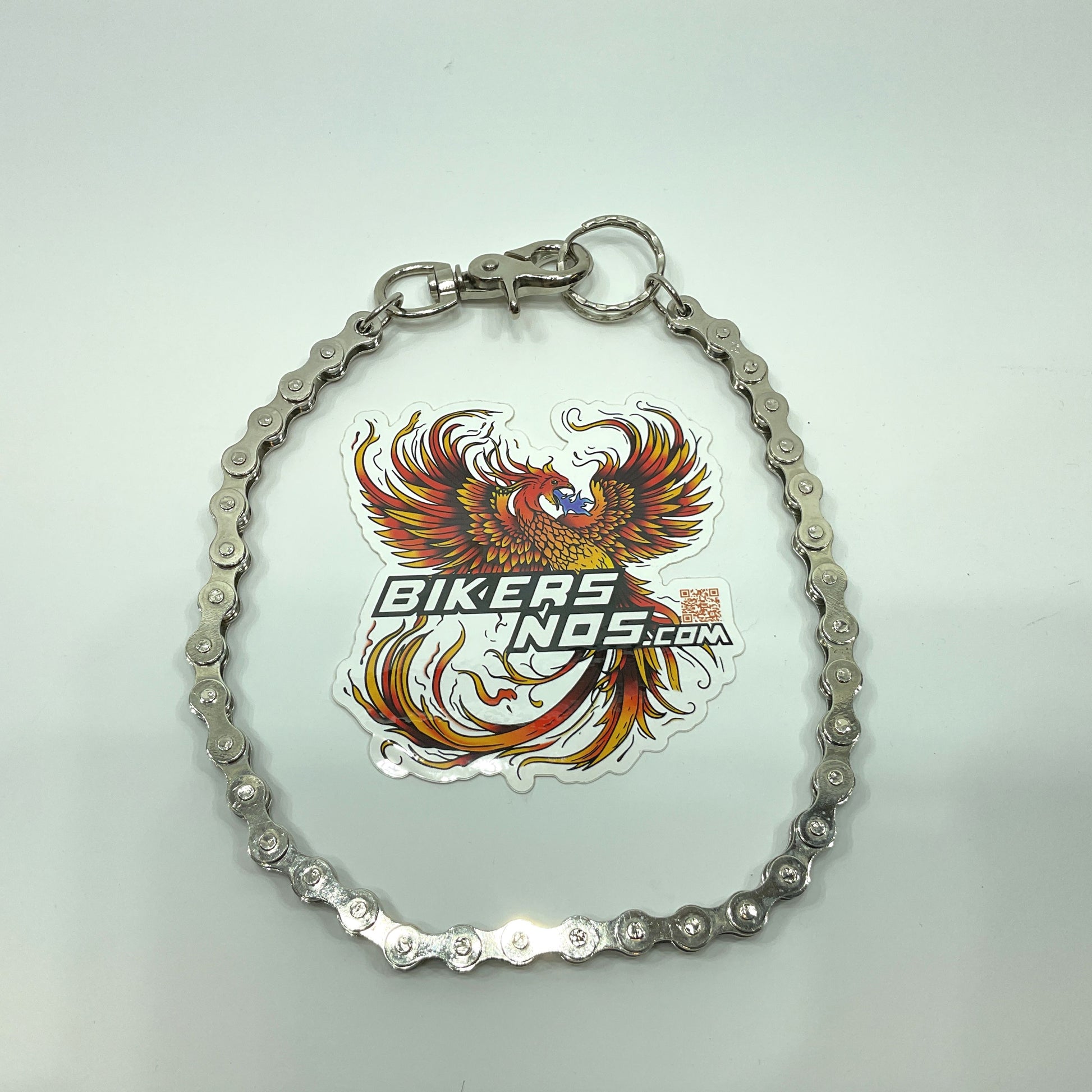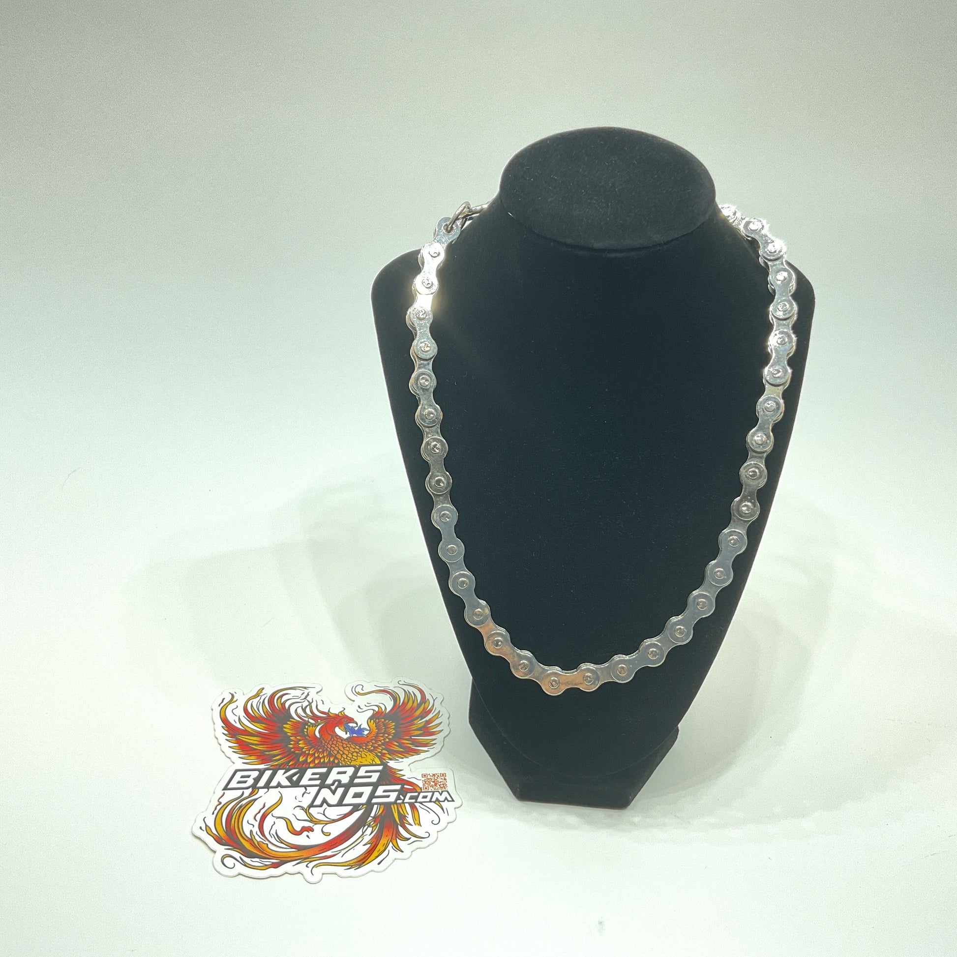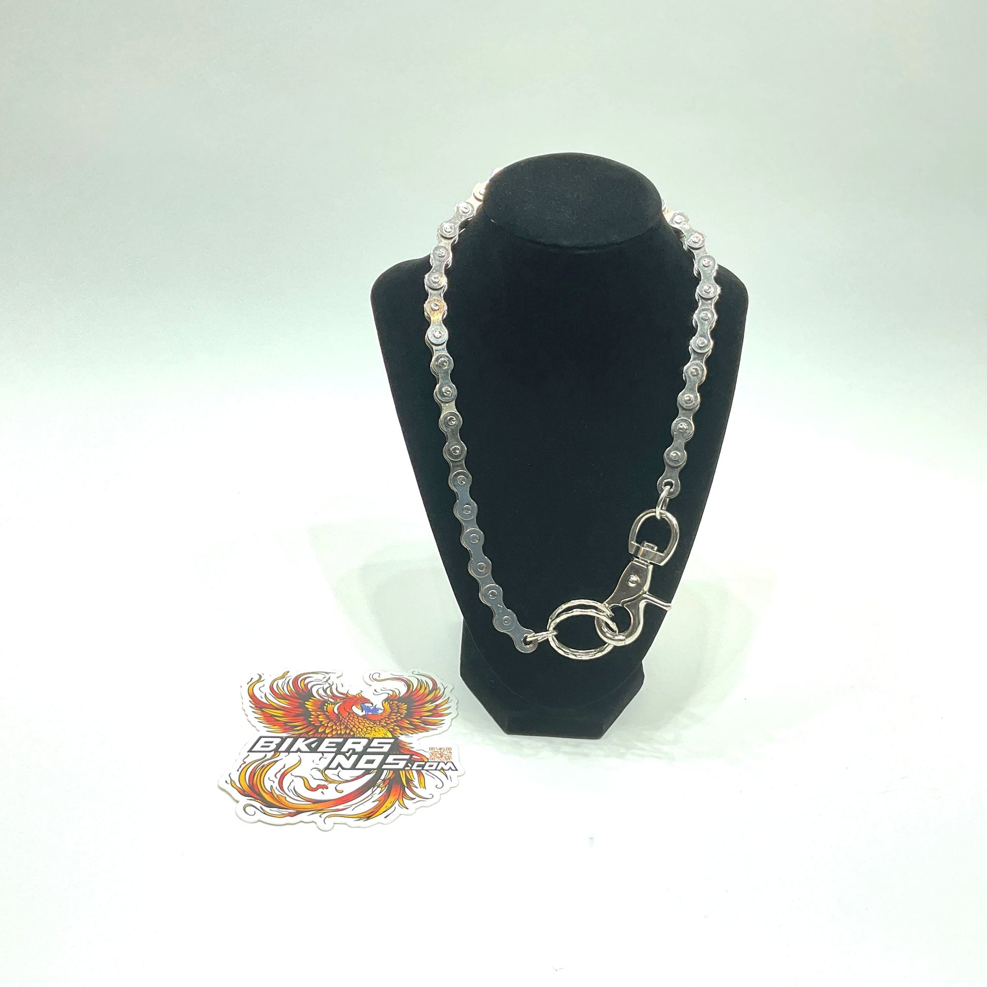 This piece is perfect for motorcycle or punk enthusiasts, the silver chain design adds an edgy element to any outfit. It is made of stainless steel bike chain and laid out is 22 inches long. It is multi-use and can be used as a wallet chain or as a men's necklace.