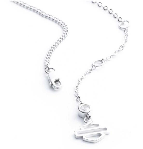 Harley-Davidson® Women's Lightening Charm Necklace & Earring Set - Silver, 34S00018. Box chain links create a gorgeous and eye-catching chain design. Necklace features stunning lightening charm with logo bar accented with cubic zirconia stones. Includes stunning lightening bolt studded earrings. Cubic Zirconia is a diamond simulant composed of zirconium dioxide. Crafted from high-quality, shiny Sterling Silver. Adjustable 16" chain with a secure lobster clasp closure and 3 inch extender. This stunning gift set is perfect to add to your Harley® collection. 34S00018
