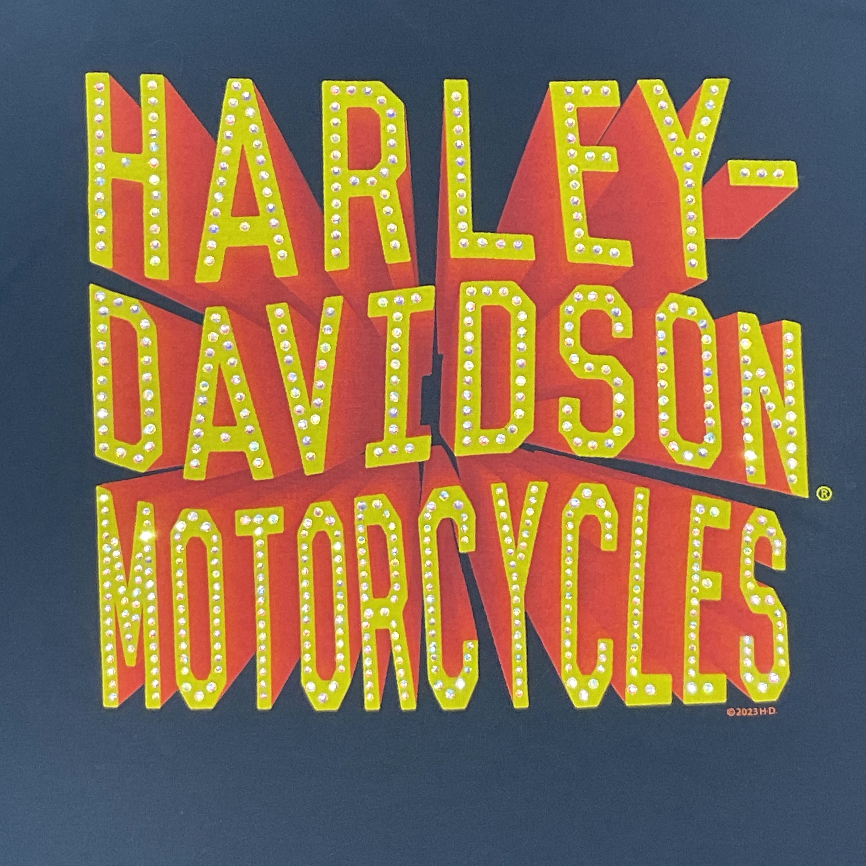 Stunning retro Harley-Davidson script graphic with rhinestone embellishment