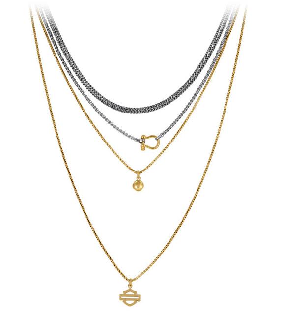 Harley-Davidson® Women's Multi-Layers Two Tone Dangle Necklace Pack - Silver/Gold, HDN0506. A variety of stunning chain links create a gorgeous and eye-catching layered design. Includes an iconic Bar & Shield logo charm. Constructed from high-quality, Stainless Steel with silver and gold finishes. It will not rust, tarnish or fade. Adjustable 16" chain with a secure lobster clasp closure. Mod Jewelry is hand crafted with the highest attention to detail and quality, utilizing the finest materials. This stunning necklace is the perfect accessory for any occasion. HDN0506