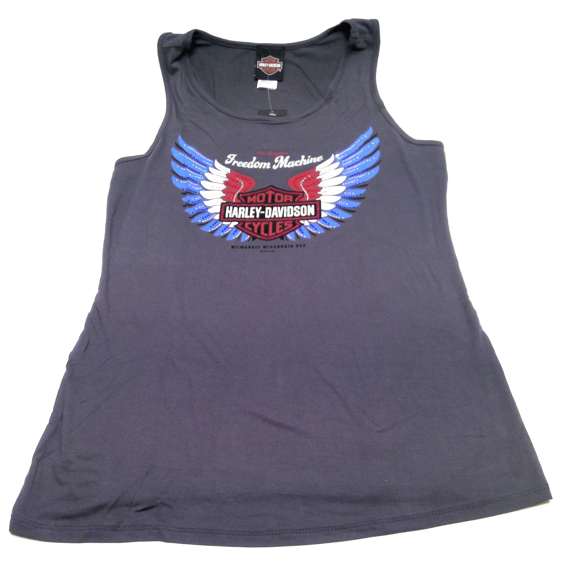 Harley-Davidson® Women's Spread Your Wings Sleeveless Tank Top - Gray, HT4697GRY. Beautifully designed patriotic winged Bar & Shield logo graphic embellished with rhinestones. Attractive scoop neck and racerback. Extremely soft and silky high-quality material. Styled from ever-flattering rayon-blend that hugs your curves beautifully. Made of 95% rayon and 5% spandex. Ideal tank to pair with your favorite denim! Made in the USA.