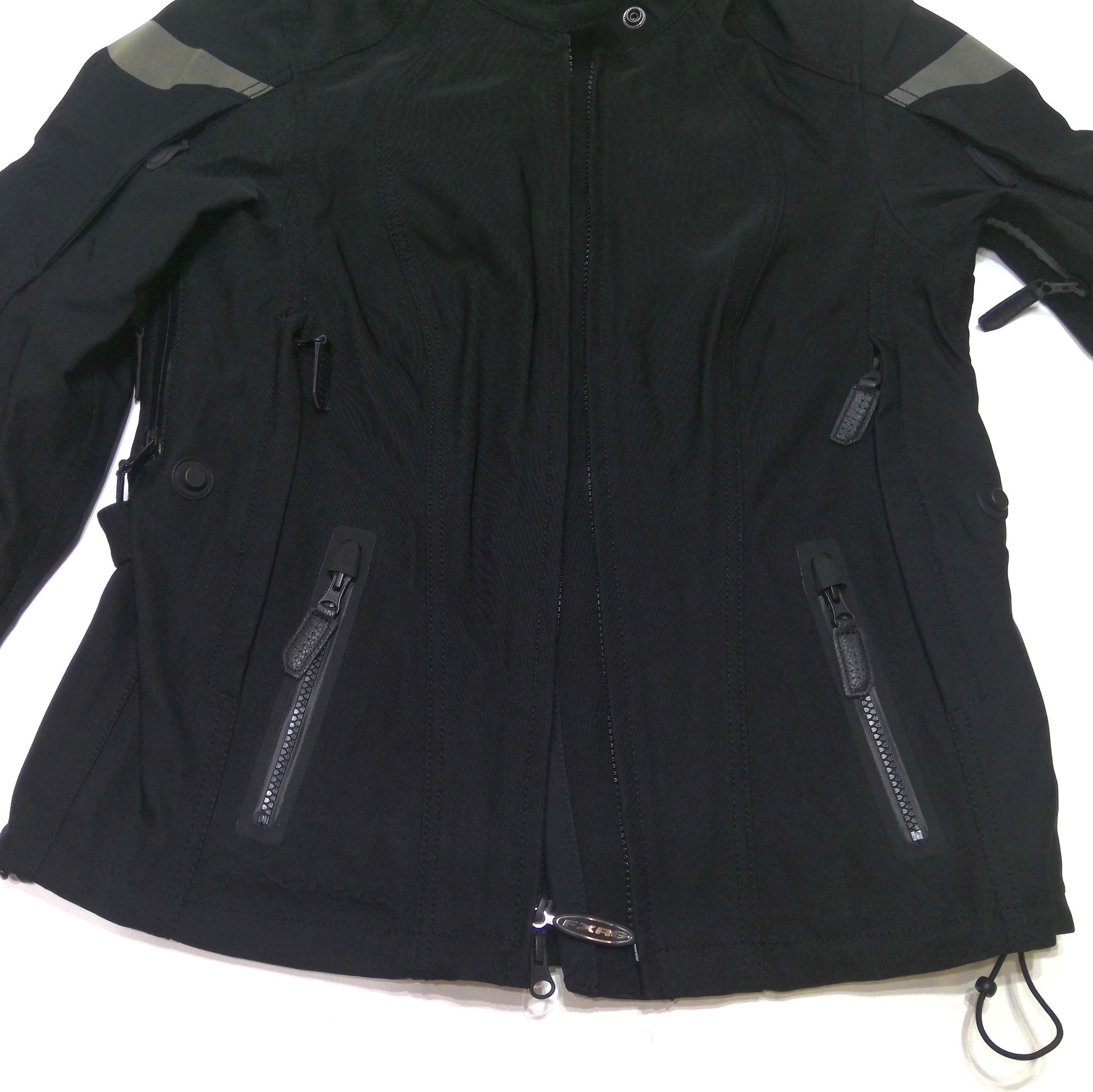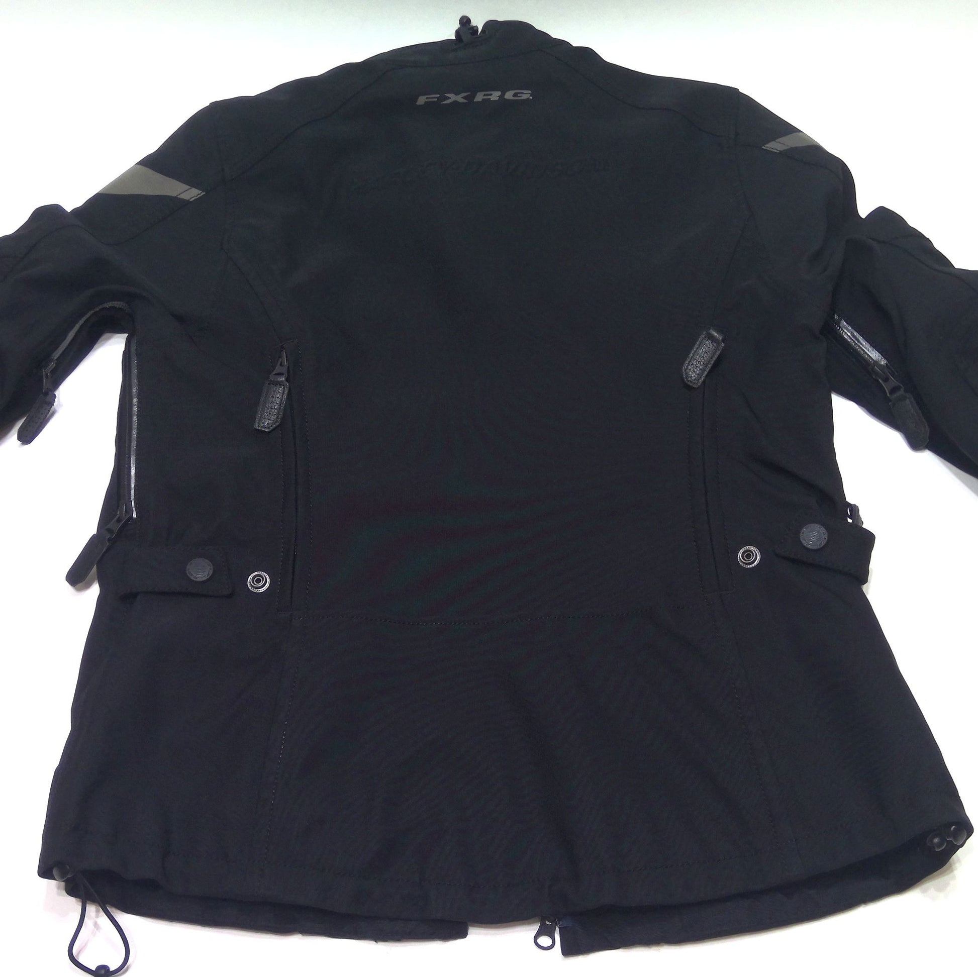 Harley-Davidson® Women's FXRG® Triple Vent System™ Waterproof Riding Jacket, 98266-19VW. Stay Cool: Patented Triple Vent System™ for customized cooling with stay open bungee tab for wider opening, less bulk, and increased airflow. Sleeve vents for added ventilation. Stay Warm: Compatible with FXRG® Thinsulate® Mid-Layer (98269-19VW, sold separately) for customizable warmth. Stay Dry: Waterproof, breathable Schoeller c_change® construction ensures optimal body climate. Seam-sealed. Waterproof zippers and pockets. Neck cinch to help block the elements. Interior storm flap. Stay Comfortable: Coolcore® lining wicks moisture from the body and moves sweat through the Schoeller c_change® breathable membrane for year-round comfort through thermal regulation. Fit & Mobility: Pre-curved sleeves. Bungee cord and toggle hem. Snap waist tabs. Jacket-to-pant back zipper attaches to FXRG® Waterproof Overpant (98267-19VW, sold separately) for full coverage. Ride-Enhancing Features: Sewn-in flexible, lightweight Dianese Pro-Shape body armor at elbows and shoulders. Back body armor pocket fits lightweight Dianese Pro-Armor back body armor (98317-19VR, sold separately). Snap-tab mandarin collar with interior collar keeper. Rolled collar and chin pad for comfort. Easy-to-reach back vents. Two-way zipper front. Zipper cuffs. 3M™ Scotchlite™ Reflective Material stripes and graphics. Pockets: Zipper hand-warmer pockets. Interior Faraday pocket for increased information security. Additional interior pockets include one stash pocket, one zipper pocket with media port, and three credit card slots. Design Details: Contrasting vent linings. Printed graphics and custom FXRG® tape on lining. Embossed graphics. Materials: Schoeller c_change® four-way stretch three-layer soft shell is 10% polyurethane, 4% elastane, 74% polyamide, 12% polyester. 100% polyester Coolcore® upper body lining. Polyester mesh lower body and sleeve lining. Polyester twill lower back lining. 98266-19VW