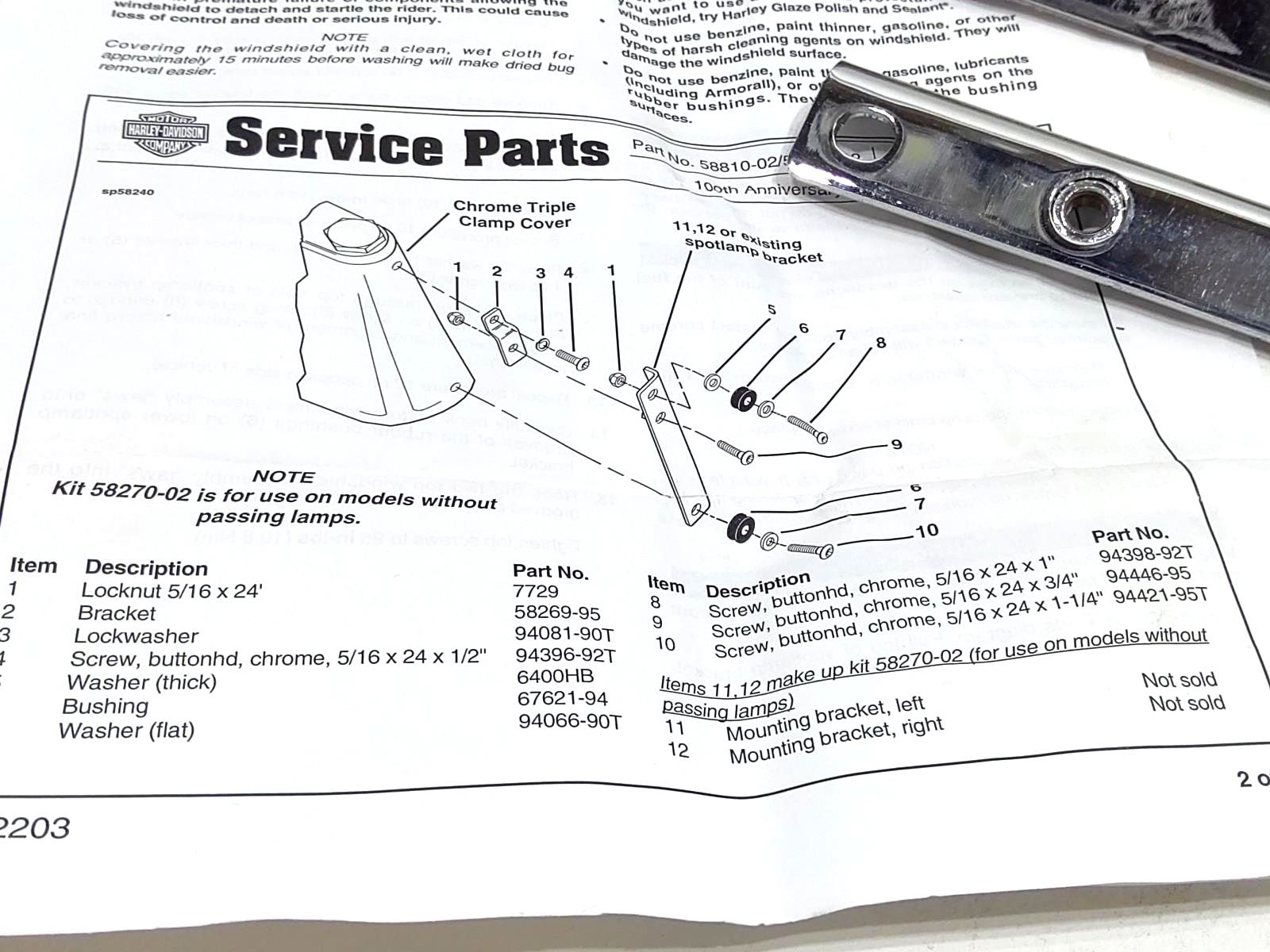 This hardware kit is required when installing windshield 58810-02 on 1986-1999 FLSTC, FLSTN or 1990 later FLSTF models without passing lamps.