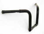 • Black Powder coated 10" rise. 6" backward sweep. 1 1/4"-diameter. Center section and tips taper to 1" so that standard handlebar controls fit.3-1/2 on-center knurling for firm mounting.34-1/2" wide from tip to tip. Come with drilled wiring holes..