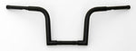 - Black Powder coated! 9" rise. 6" backward sweep. 1-1/4" diameter. Center section and tips taper to 1" so that standard handlebar controls fit.3-1/2 on-center knurling for firm mounting. 34-1/2" wide from tip to tip. Come with drilled wiring holes.