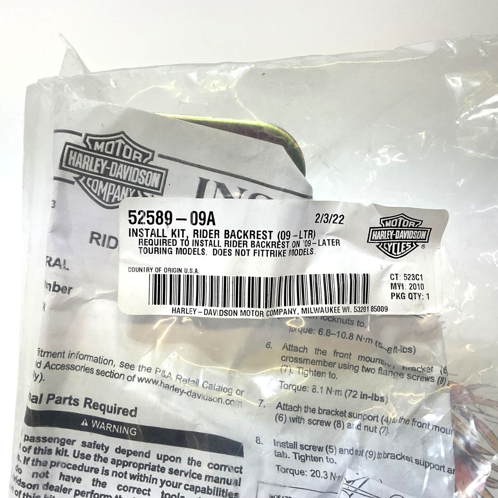 Harley Part #52589-09A New Genuine Harley Rider Driver Backrest mounting Bracket 2009 up Touring