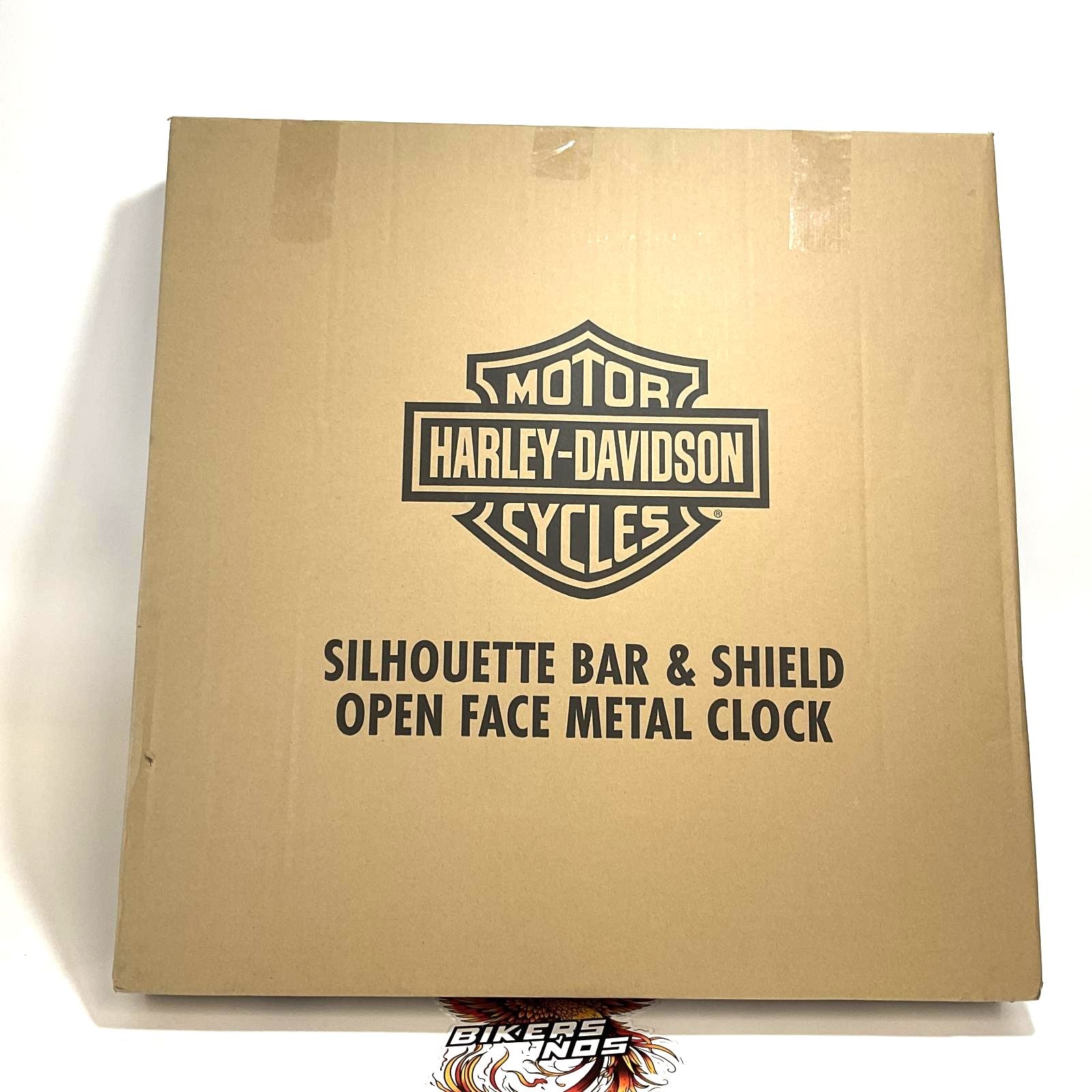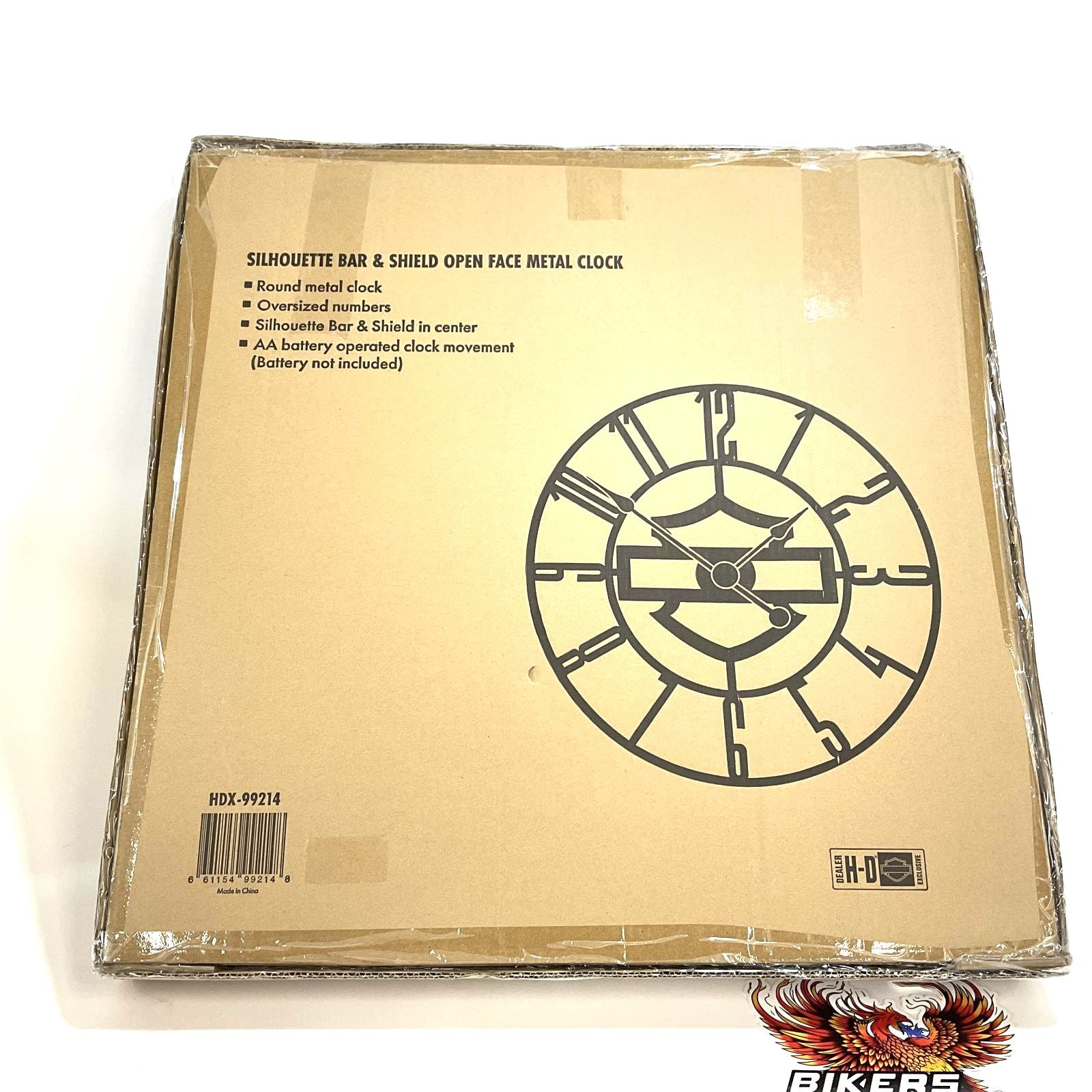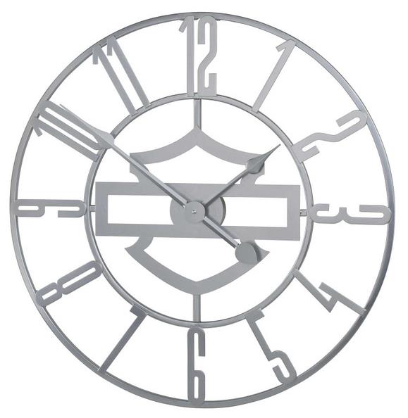 Harley-Davidson® Silhouette B&S Open Face Metal Clock - Silver, HDX-99214. Round metal clock with oversized numbers and silhouette Bar & Shield logo in center. Continuous sweep AA battery operated clock movement. Dimensions: 24" diameter.