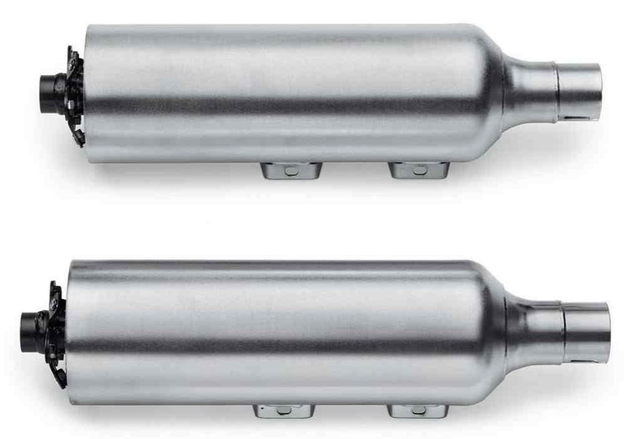 These 4.5" street compliant high-flow mufflers have been specifically tuned to deliver an aggressive exhaust note and improved performance. The straight-through perforated baffle reduces airflow restriction, and produces a rich exhaust note throughout the entire RPM range. You get a great performance, a powerful base rumble and a throaty tone while on the throttle, while maintaining a mellow note while cruising.