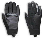 Harley-Davidson® Women's Sidari Mixed Media Full-Finger Gloves - Black, 98161-20VW. Engineered perforations provide airflow where you need it most. Ergonomic thumb and 30º pre-curved fingers. Fitted neoprene cuff with entry-assist cuff tab. Seamless palm with thumb and palm grip. Touchscreen compatible. Rubber stripes. Printed graphics. Mixed media construction 96% polyester, 4% spandex mesh back of hand with 50% polyamide, 50% polyurethane suede-like palm, and goatskin leather fingertips. Tricot lining back of hand. Unlined palm. 98161-20VW