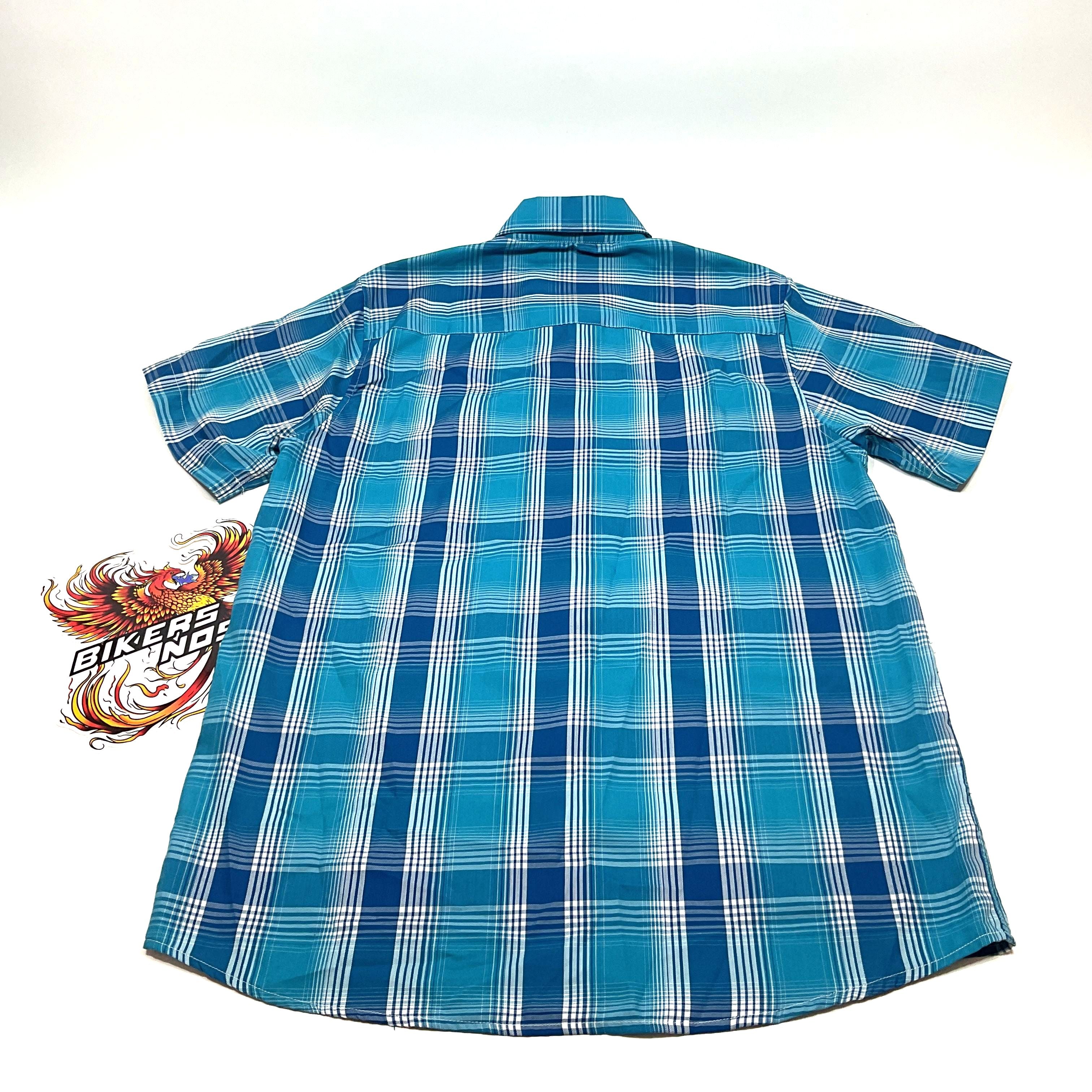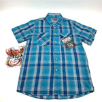 Men’s turquoise, blue, and white plaid patterned short sleeve bamboo shirt