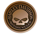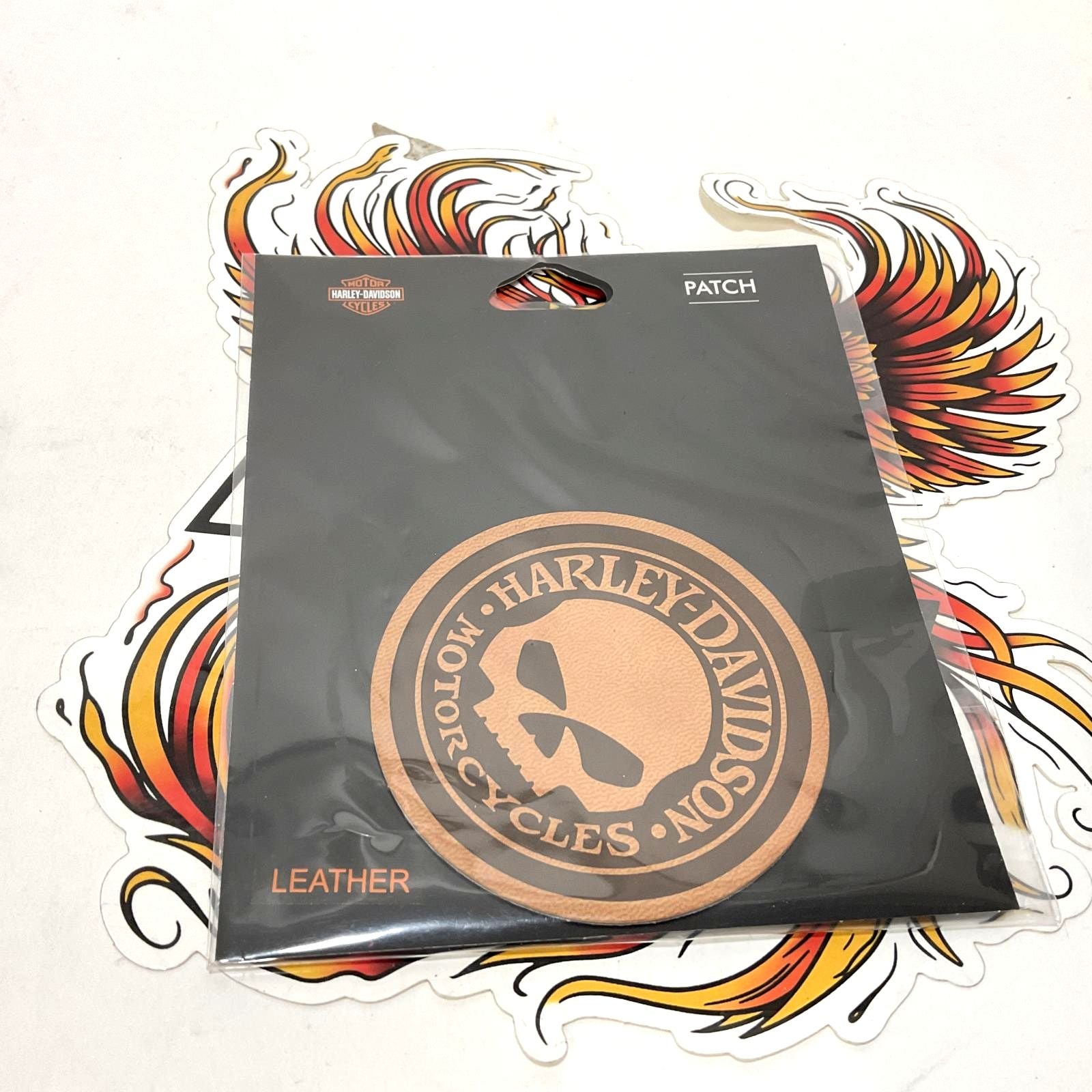 Harley-Davidson 3" Leather Willie G Skull Round Patch, 8015961. Awesome leather Willie G Skull logo. Sturdy emblem that will hold up ride after ride. Small size patch, Size: 3" round. Sew-on patch. Great looking patch to be sewn on your vest or jacket.