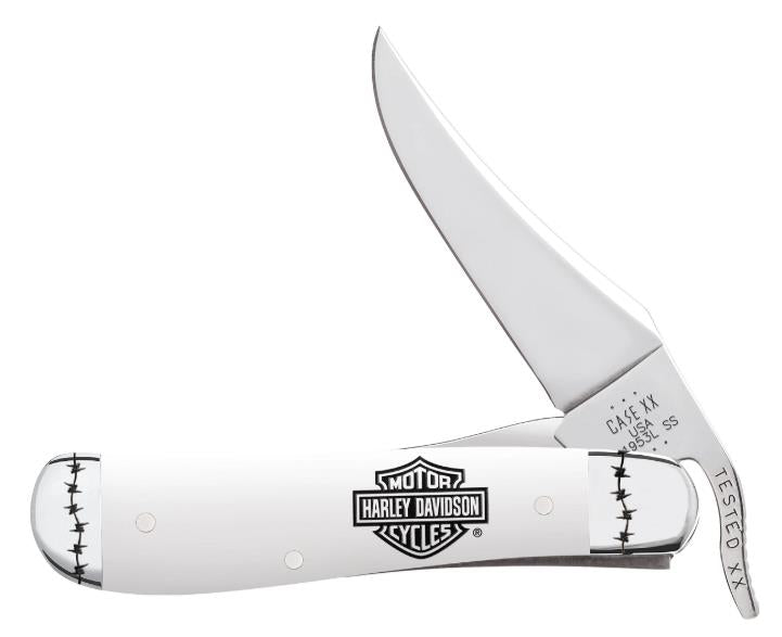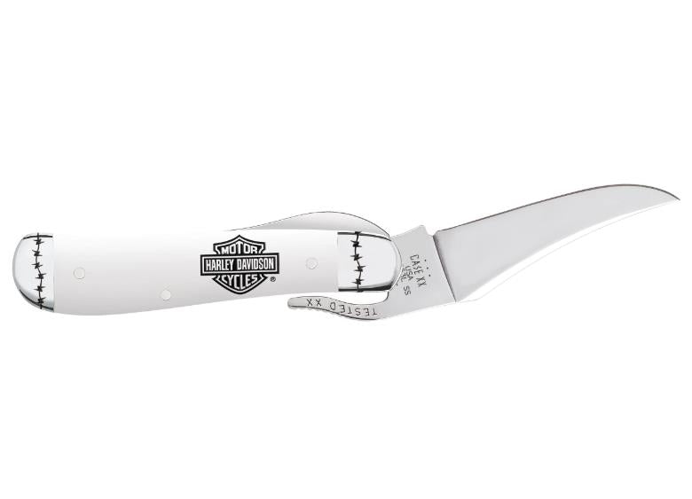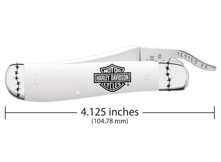 Handcrafted in the U.S.A., this classic American Case Russlock is about 4 1/8 inches long (folded/closed) and weighs approximately 2.5 ounces. The handle is smooth White Synthetic etched with a Harley-Davidson Motorcycles logo. The bolsters are Barbwire engraved Nickel Silver. This knife utilizes a 2 3/4" Locking Clip(w/Thumb Lever) blade. Stamped with pattern number 41953L SS, the blade material is Tru-Sharp Surgical Stainless Steel with Mirror-polished finish. This Russlock is a professional-grade tool that comes with a Limited Lifetime Manufacturer's Warranty and is not designed nor intended to be used on or against humans. So, whether you're hunting for authentic cutlery to collect, a top quality knife to give as a gift, or a superior tool to use, don't pass this one up! If you have questions about this 52249 Russlock.