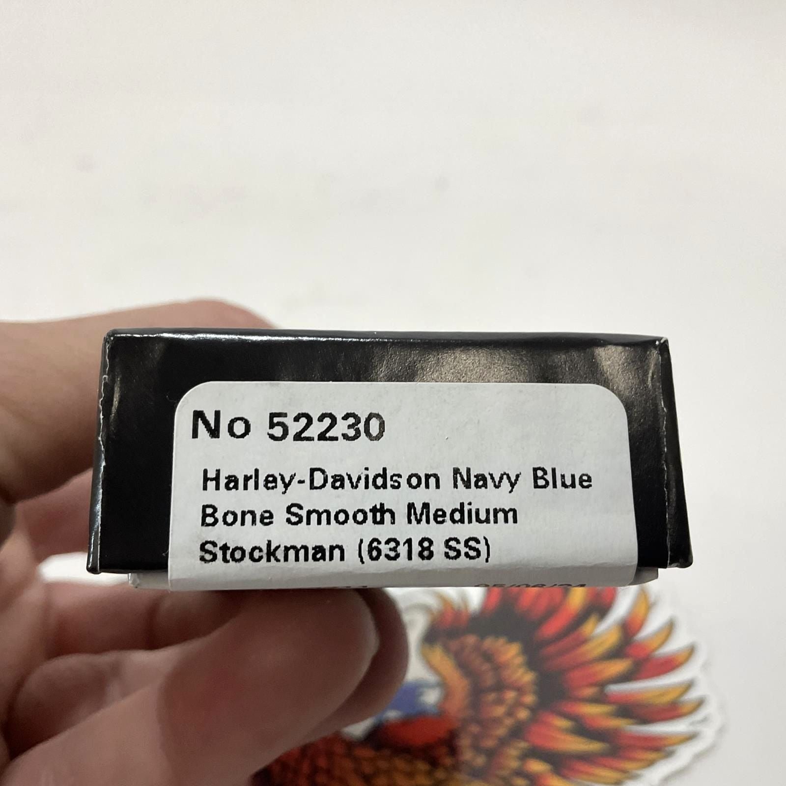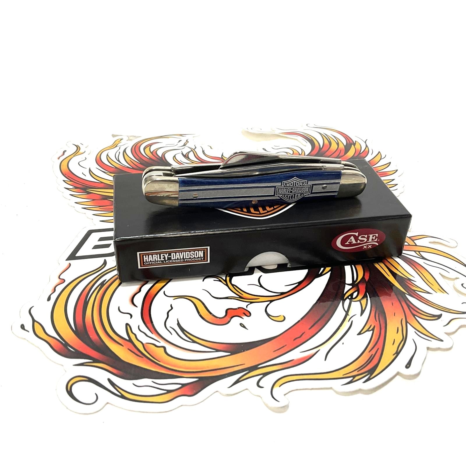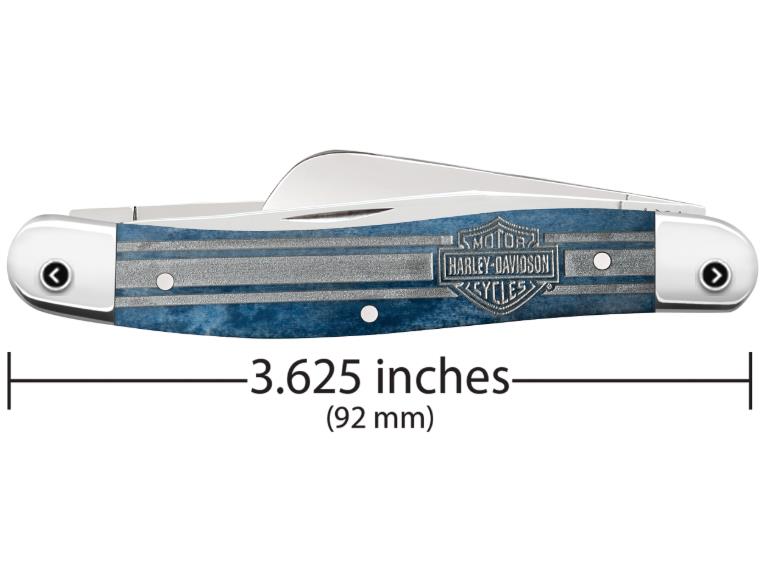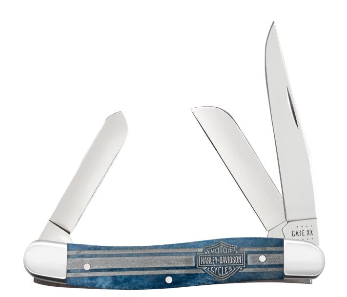 Handcrafted in the U.S.A., this classic American Case Stockman is about 3 5/8 inches long (folded/closed) and weighs approximately 2.2 ounces. The handle is Navy Blue Bone etched with Harley-Davidson Logo & Stripes embellishment. The bolsters are highly polished Nickel Silver. This knife utilizes a 2 1/2" Clip blade, 1 7/8" Sheepfoot Coping blade and 1 3/4" Spey blade. Stamped with pattern number 6318 SS, the blade material is Tru-Sharp Surgical Stainless Steel with Mirror-polished finish. This Stockman is a professional-grade tool that comes with a Limited Lifetime Manufacturer's Warranty and is not designed nor intended to be used on or against humans. So, whether you're hunting for authentic cutlery to collect, a top quality knife to give as a gift, or a superior tool to use, don't pass this one up! If you have questions about this 52230 Stockman.