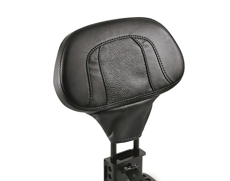 Add back support for long-haul riding comfort. Contoured backrest pad is shaped to provide full lower back support without pushing the rider forward and the slim profile offers the passenger a few more inches of room. An adjustable support bracket with four mounting locations accommodates different seats and riding positions. The backrest pad angle can be adjusted for maximum comfort.