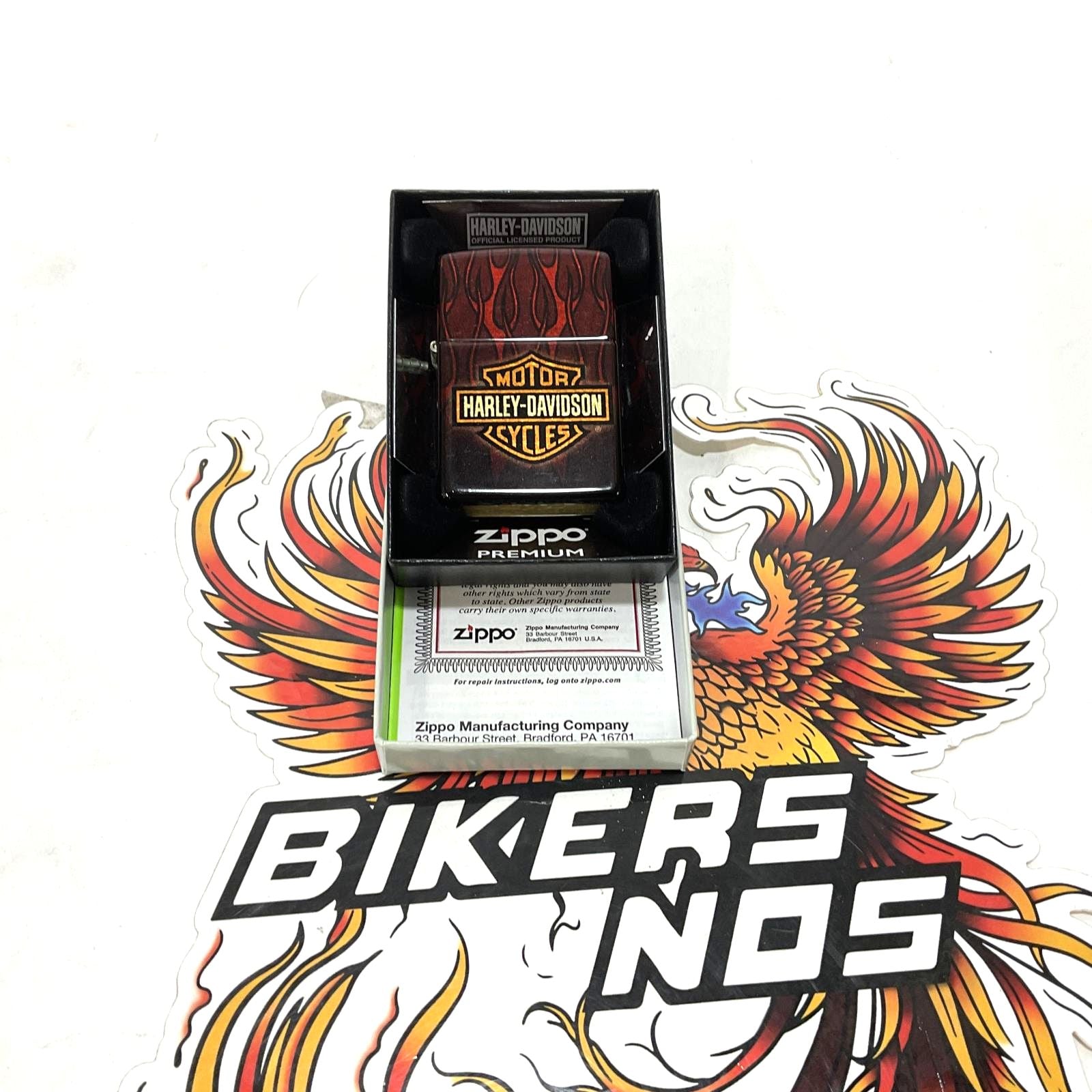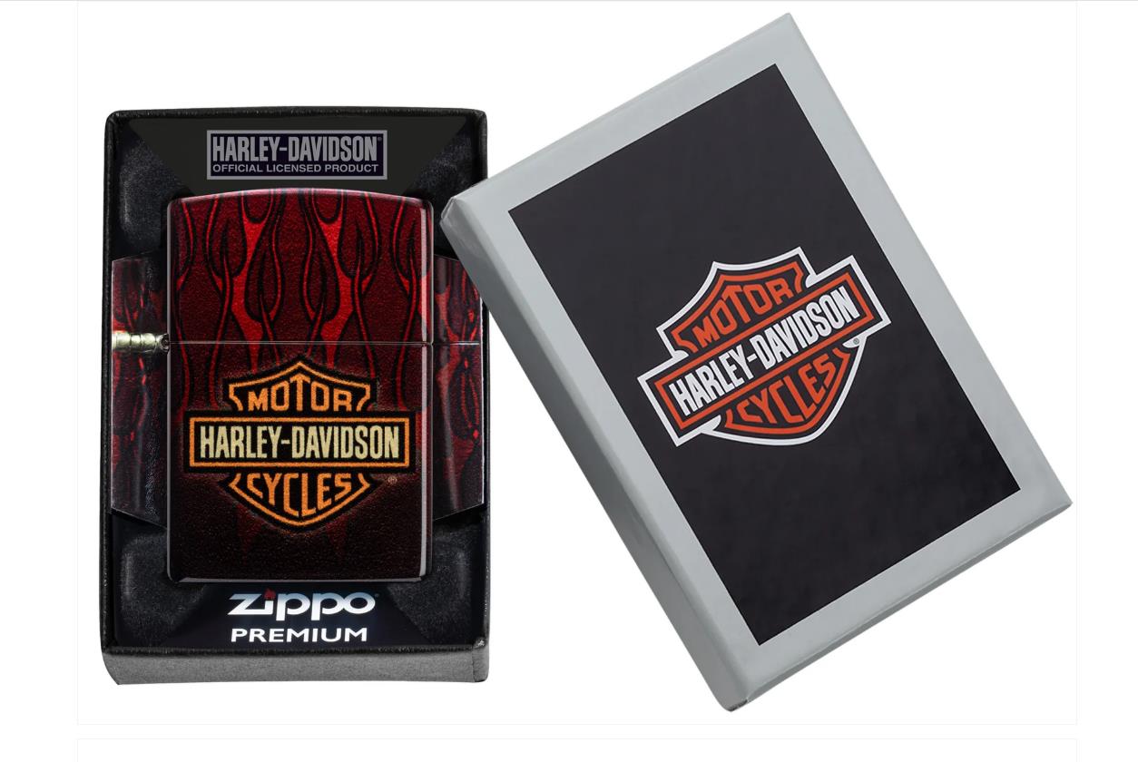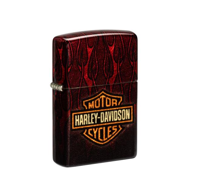 This House of Harley lighter showcases the iconic Harley-Davidson logo surrounded by flickering flames. The brass tones of the lighter's case add to its overall appeal, while the gold-flashed insert perfectly complements the look. This beautiful lighter is an excellent gift idea and comes packaged in an elegant gift box. For optimal performance, we recommend using Zippo lighter fuel to fill it up.