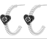 Sterling silver setting features sculpted hoops with black-tone heart charm including raised Bar & Shield® silhouette with butterfly backs.