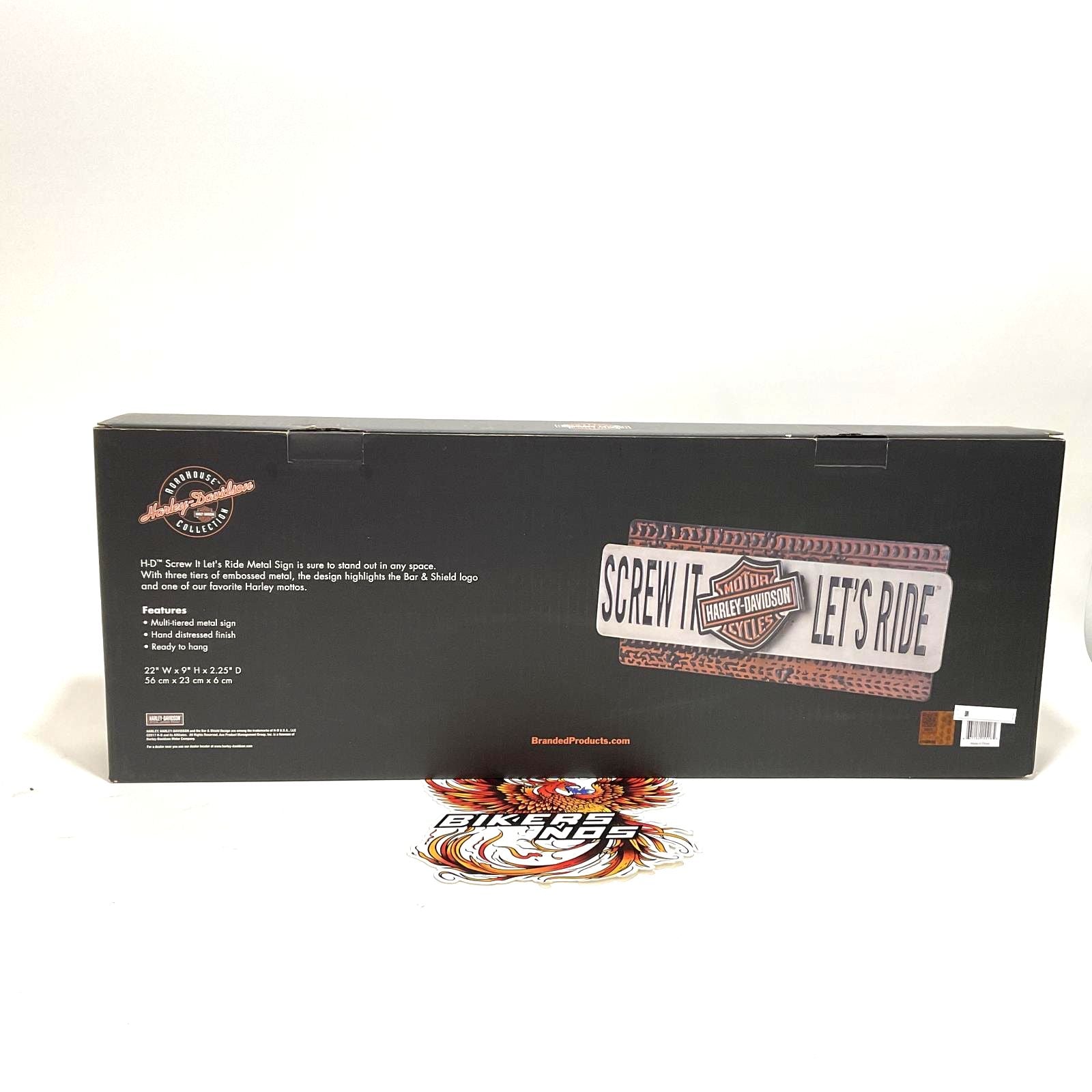 Harley-Davidson® Screw It Let's Ride Metal Sign, HDL-15518. Screw It Let's Ride Metal Sign is sure to stand out in any space. Distressed, hand finished accents and three tiers of embossed metal highlight the Bar & Shield logo and one of our favorite Harley mottos. Size: 22" W x 9" H x 2.25" D.