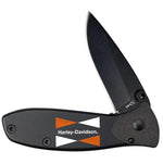 This manual folder’s handle is constructed from black coated stainless steel, delivering toughness and a solid grip in the hand. The front scale is adorned with a retro Harley-Davidson graphic—a vintage-style logo that nods to the brand’s rebellious heritage—paired with textured bolsters for added control. A black stainless steel pocket clip offers secure tip-down carry for the road ahead. At 3.75" closed, it carries easy in the pocket or vest, ready for utility tasks or a quick slice of freedom.