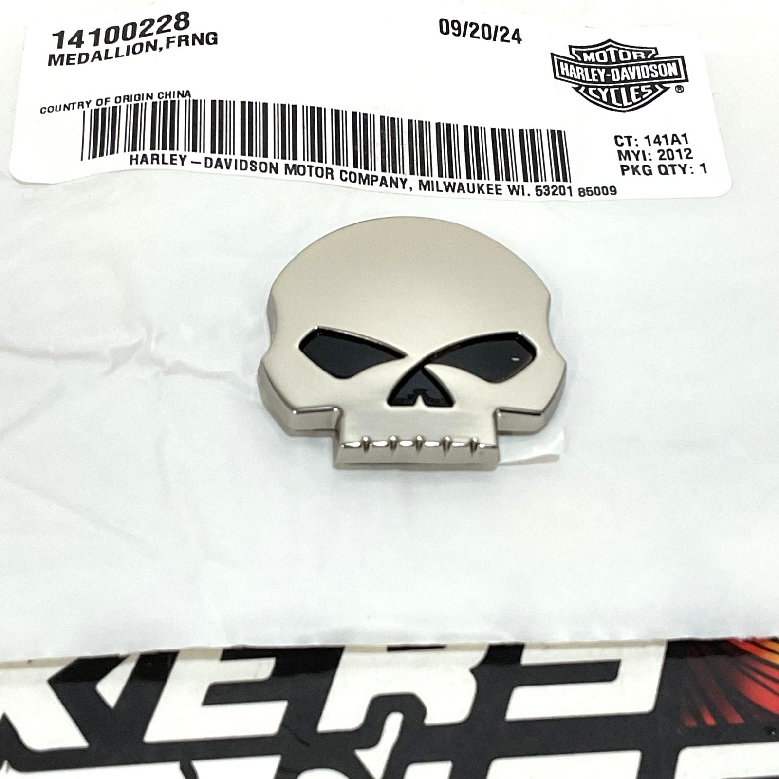 Harley-Davidson® Antique Nickel Willie G Skull Decorative Medallion, 14100228. This product is a Universal Fit. Display a touch of attitude. Ideal for use on plate-style sissy bar uprights and battery covers, the adhesive backing on these high-quality cast medallion allows easy installation on most flat surfaces. Antique nickel finish. Size 1.5" L x 1.5"
