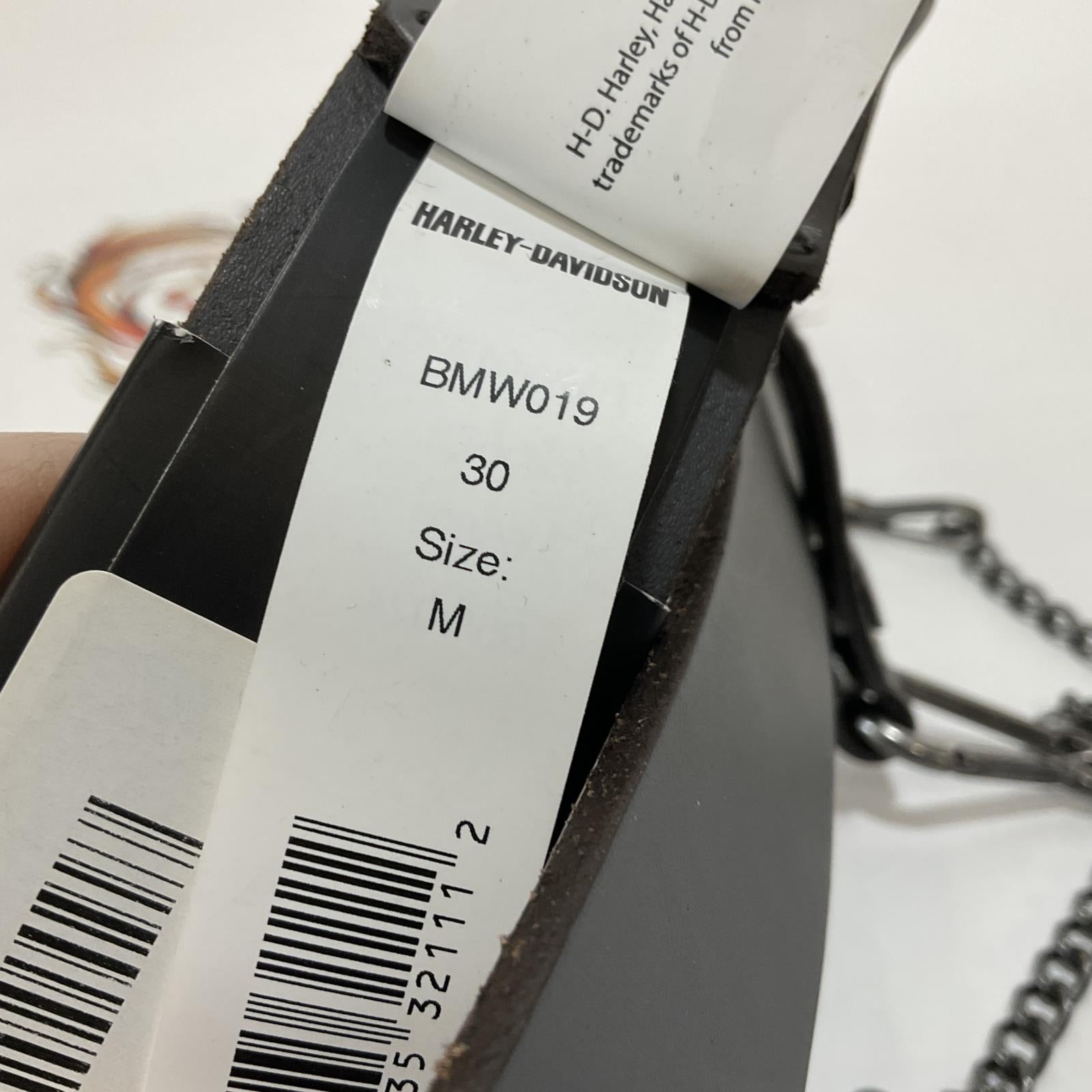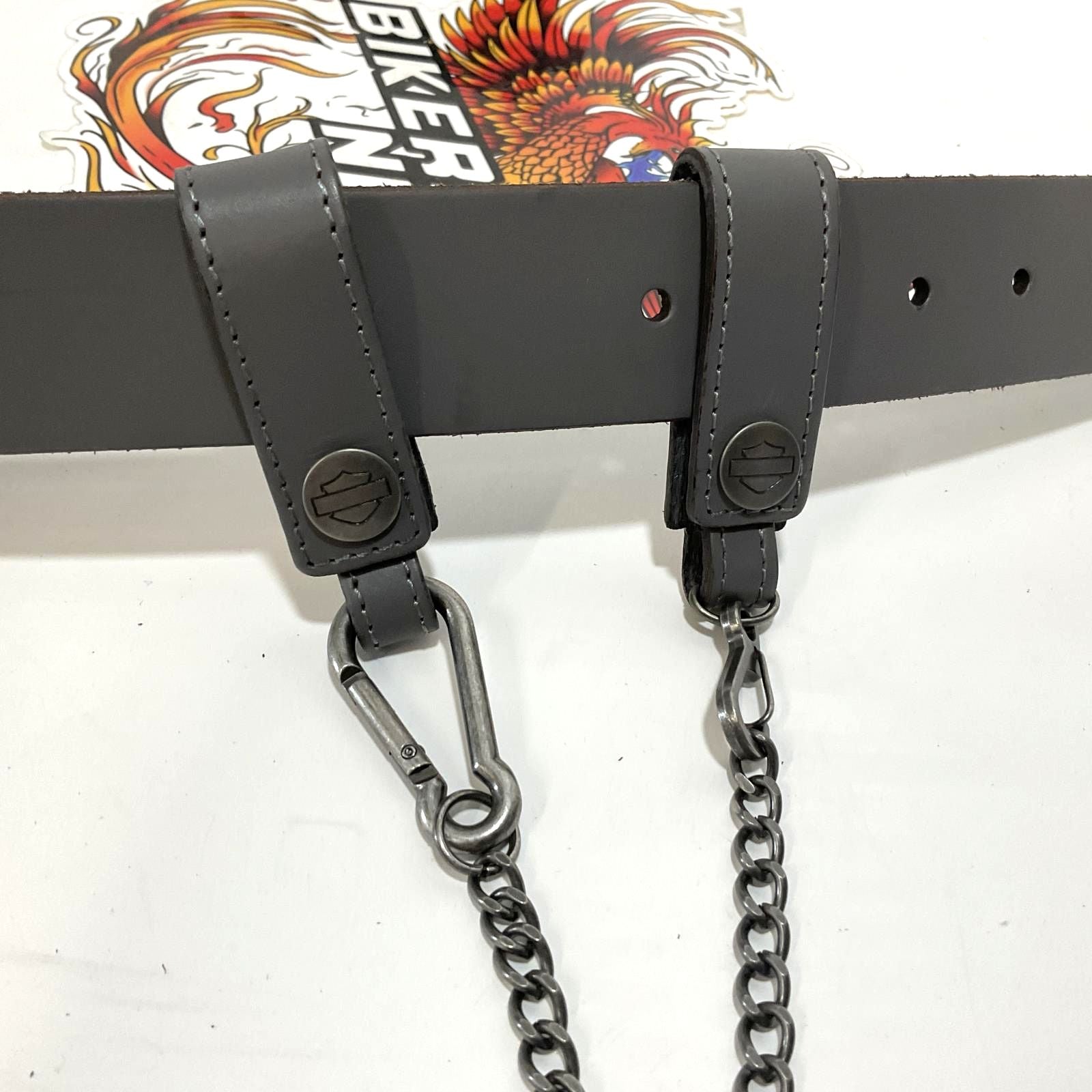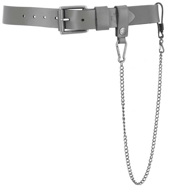 Harley-Davidson® Women's Utility Fob Chain Genuine Leather Belt - Gray, BMW019/30. Antique nickel finishes. Made from high-quality genuine leather. Detachable keepers and chain. Size: 38mm wide.