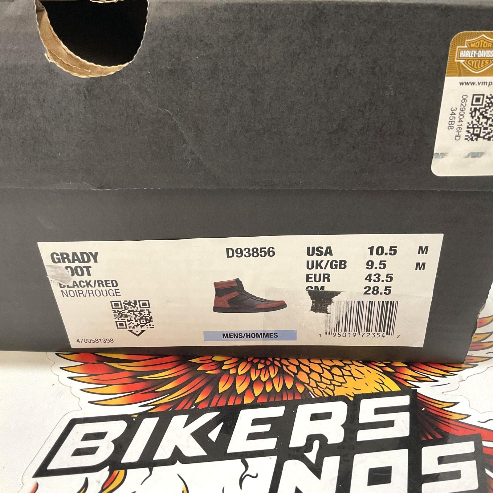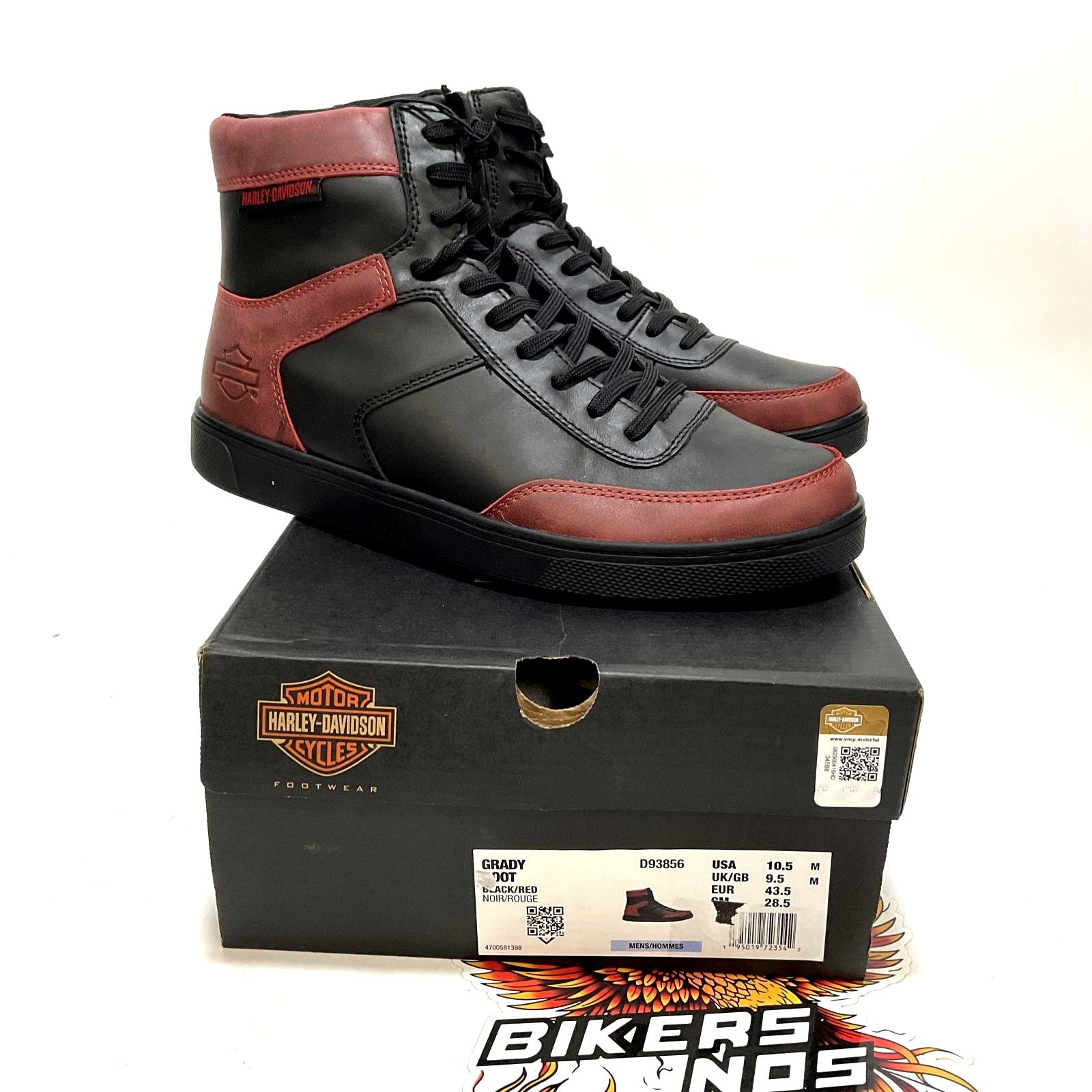 The Grady sneaker boot features stark black and dark-red block colorways. Featuring durable full-grain leather uppers with a rubber outsole and a full-length mesh lining, these boots provide the stylish comfort needed for work and for play at any venue. The Grady was designed to bring a new modern aesthetic to the Harley-Davidson® footwear line. The badging is subtle, with a debossed Bar & Shield® silhouette on the heel’s counter and fabric logo badging at the top of the shaft in matching red. The tongue is padded for additional comfort. The boot's sole, insole and upper are bound using cement construction processes, a time honored and durable method that allows for a flexible and easy stride. A matching Bar & Shield® logo can be found on the street-side, at the instep. Uptown, downtown, at work or play, or on a bike, these boots will get you there in style and comfort. Shaft height: 5.25", Heel height: 1". Sizes US: M 7-12, 13. Manufacturer Part Number, D93856. Wolverine® and Harley-Davidson® have a long tradition of bringing original and functional footwear to our motorcycle enthusiasts. Loyal. Tough. Fearless. Our Footwear embodies the spirit of the open road, as well as the men and women who proudly wear the name. With a growing global presence, Harley-Davidson® Footwear markets functional riding and fashion footwear to anyone who seeks quality and values the Harley-Davidson® brand. Whether it's performance or fashion, we have what you need. Officially Licensed Harley-Davidson® Product by Wolverine®.