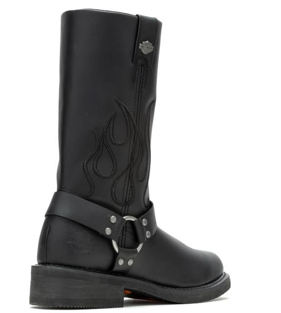 The classic Hustin harness boot has been elevated with subtle flame embroidery detail. Featuring full-grain leather and full-length YKK® locking inside zippers for a quick and secure fit, this is a style ready for any destination. A full-length mesh lining means total comfort no matter where you go. The squared-off toe gives way to the classic harness straps, all attached to the famous harness O’Ring. A metal Bar & Shield® badge adorns the pull-on strap. A debossed logo is also found on the heel’s counter. The street-side rubber outsole sports an inlayed orange Bar & Shield® logo at the instep. The foot and heel tread elements are in Harley® orange, was well. The boot’s styling has a mild western flair, exuding just the right attitude for Harley® riders. The boot's sole, insole and upper are bound using resoleable Goodyear® Welt construction processes, the most labor intensive and durable construction method available. This Hustin harness boot is streamlined, simple, clean, and ready for business. Shaft height: 11"; Heel height: 1.5". Manufacturer Part Number D96310. Wolverine® and Harley-Davidson® have a long tradition of bringing original and functional footwear to our motorcycle enthusiasts. Loyal. Tough. Fearless. Our Footwear embodies the spirit of the open road, as well as the men and women who proudly wear the name. With a growing global presence, Harley-Davidson® Footwear markets functional riding and fashion footwear to anyone who seeks quality and values the Harley-Davidson® brand. Whether it's performance or fashion, we have what you need. Officially Licensed Harley-Davidson® Product by Wolverine®.