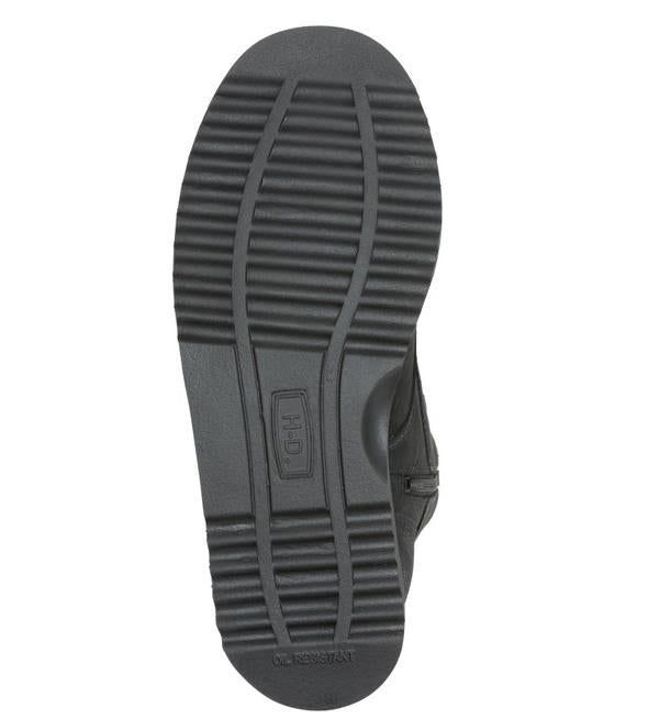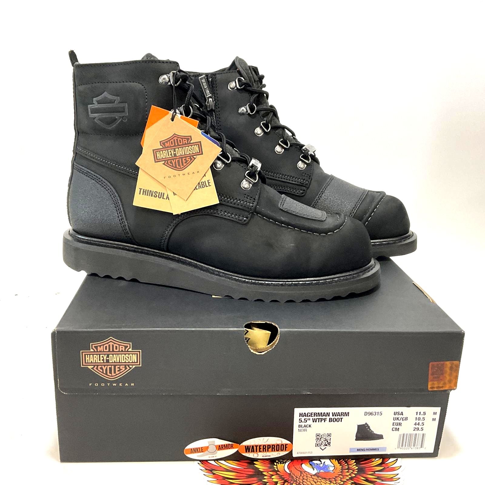 Black Waterproof Motorcycle Boots, D96315. With the Hagerman Warm motorcycle riding boot you’ll be prepared for whatever Mother Nature throws at you. Enjoy the road wherever and whenever it may take you with 200g Thinsulate Insulation, waterproof leather, 3M™ reflective piping, premium D30® ankle protection, and a cozy wool tongue. The toe is classically rounded with a Harley-Davidson® metal badge on the bottom lace. The wool tongue has a Harley® logo at its top. A silhouette Bar & Shield® logo is subtly debossed on the outside face of the shaft. With reliable Goodyear® welted outsoles and YKK® locking inside zippers, this boot is constructed for a life as tough as it looks. The ribbed toe features an additional shifting layer of leather. Donning is easy: Step in, zip-up, tie-off and you are out the door. Made with waterproof full-grain leather, the boot’s lining is finished with a breathable Hydro-Guard™ waterproof membrane. The lightweight polyurethane outsole perfectly matches the rich black leather uppers. These boots are ready for the long haul. For riding or strutting around town, this Hagerman Warm will get you where you want to be. Shaft height: 5.5", Heel height: 1". Sizes US: M 7-12, 13. Manufacturer Part Number, D96315. Wolverine® and Harley-Davidson® have a long tradition of bringing original and functional footwear to our motorcycle enthusiasts. Loyal. Tough. Fearless. Our Footwear embodies the spirit of the open road, as well as the men and women who proudly wear the name. With a growing global presence, Harley-Davidson® Footwear markets functional riding and fashion footwear to anyone who seeks quality and values the Harley-Davidson® brand. Whether it's performance or fashion, we have what you need. Officially Licensed Harley-Davidson® Product by Wolverine®. *Riding Appropriate – Abrasion, slip, and oil-resistant boots, ideal for riding motorcycles.