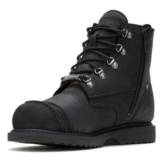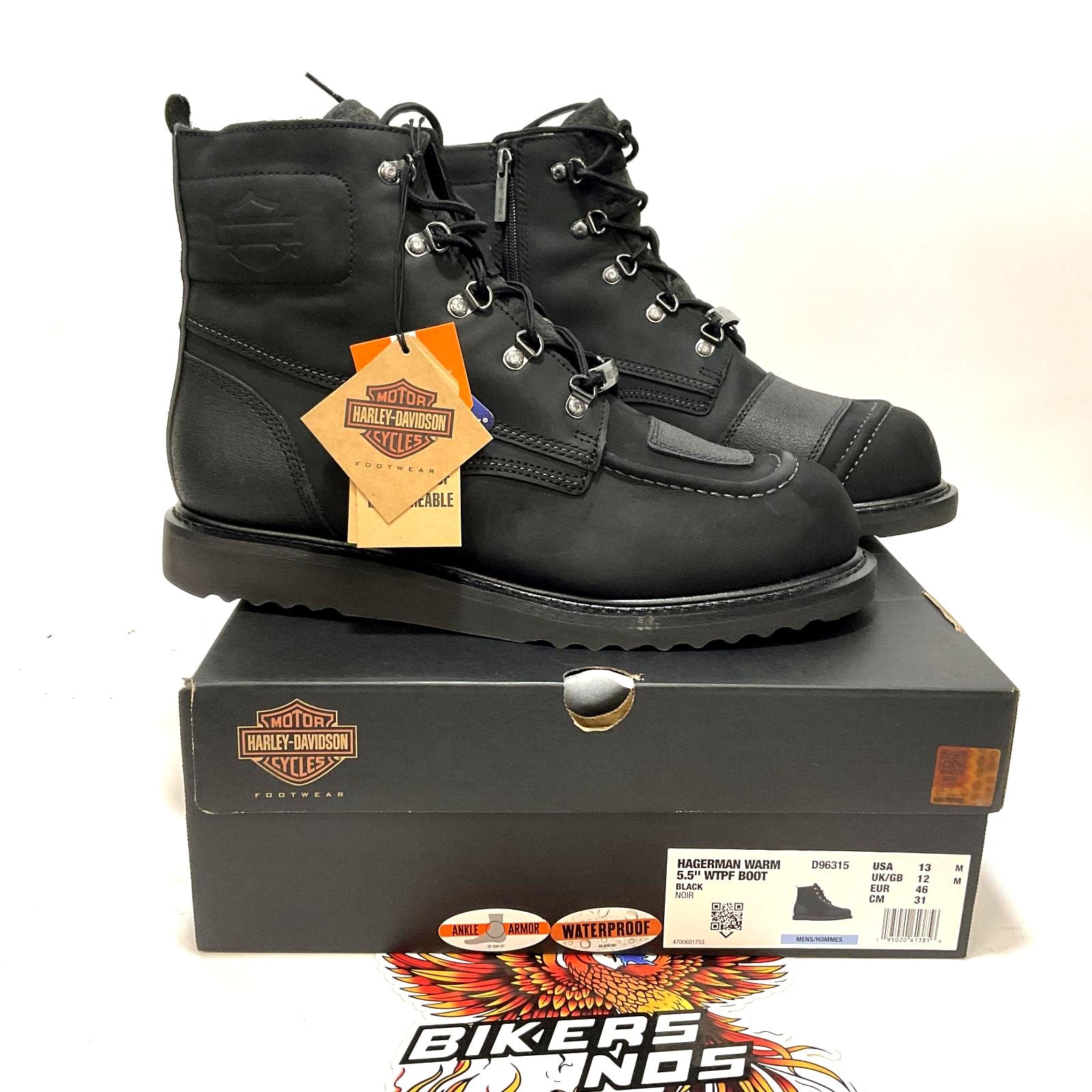 Black Waterproof Motorcycle Boots, D96315. With the Hagerman Warm motorcycle riding boot you’ll be prepared for whatever Mother Nature throws at you. Enjoy the road wherever and whenever it may take you with 200g Thinsulate Insulation, waterproof leather, 3M™ reflective piping, premium D30® ankle protection, and a cozy wool tongue. The toe is classically rounded with a Harley-Davidson® metal badge on the bottom lace. The wool tongue has a Harley® logo at its top. A silhouette Bar & Shield® logo is subtly debossed on the outside face of the shaft. With reliable Goodyear® welted outsoles and YKK® locking inside zippers, this boot is constructed for a life as tough as it looks. The ribbed toe features an additional shifting layer of leather. Donning is easy: Step in, zip-up, tie-off and you are out the door. Made with waterproof full-grain leather, the boot’s lining is finished with a breathable Hydro-Guard™ waterproof membrane. The lightweight polyurethane outsole perfectly matches the rich black leather uppers. These boots are ready for the long haul. For riding or strutting around town, this Hagerman Warm will get you where you want to be. Shaft height: 5.5", Heel height: 1". Sizes US: M 7-12, 13. Manufacturer Part Number, D96315. Wolverine® and Harley-Davidson® have a long tradition of bringing original and functional footwear to our motorcycle enthusiasts. Loyal. Tough. Fearless. Our Footwear embodies the spirit of the open road, as well as the men and women who proudly wear the name. With a growing global presence, Harley-Davidson® Footwear markets functional riding and fashion footwear to anyone who seeks quality and values the Harley-Davidson® brand. Whether it's performance or fashion, we have what you need. Officially Licensed Harley-Davidson® Product by Wolverine®. *Riding Appropriate – Abrasion, slip, and oil-resistant boots, ideal for riding motorcycles.