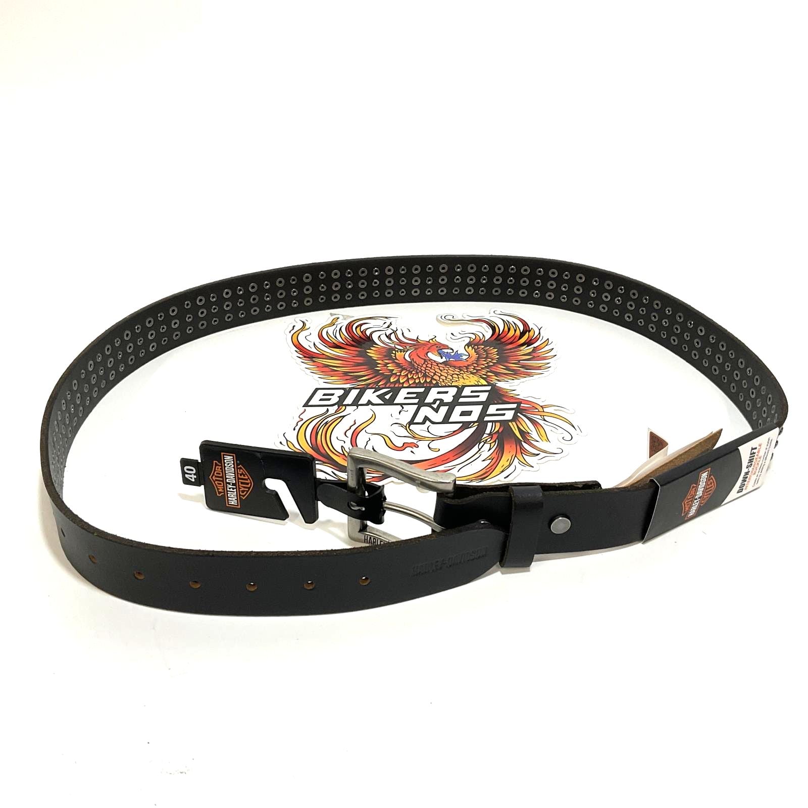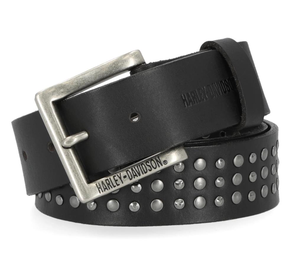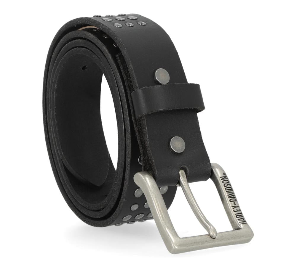 Elevate your style with the Harley-Davidson Men's Triple Row Studded Belt. Made with high-quality leather, this belt features stunning triple row studding and interchangeable snap buckle for versatility. The antique nickel and matte black finishes add a touch of edgy sophistication, while the 38mm width provides all-day comfort.