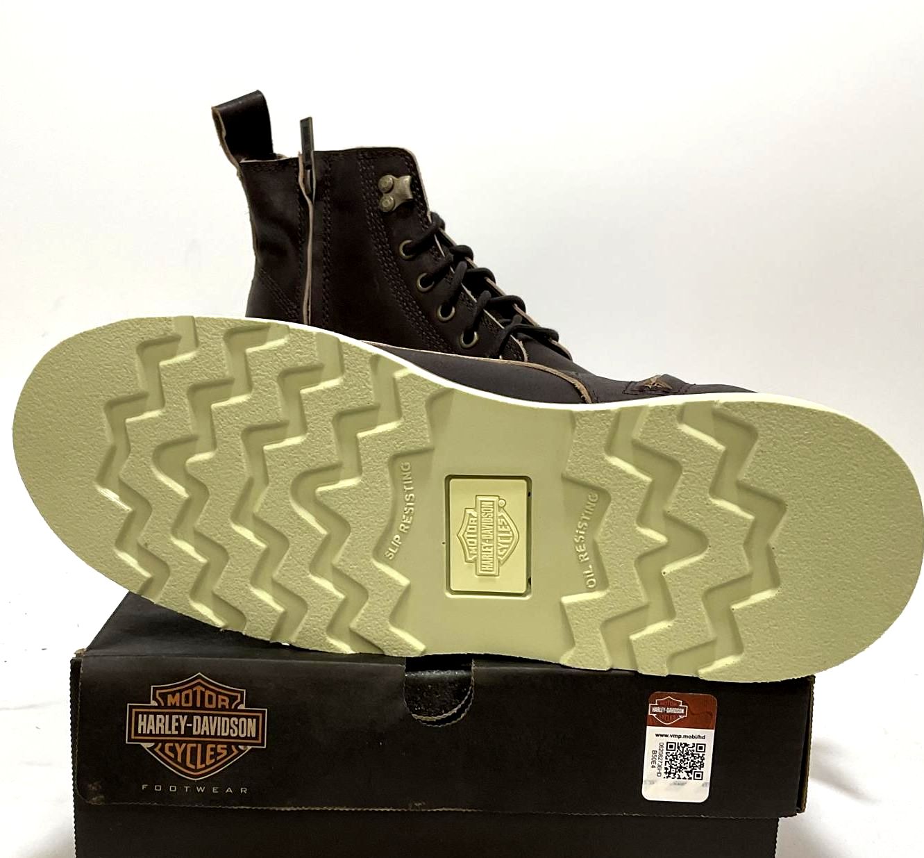 Harley-Davidson® Men's Aldredge 6-Inch Black or Brown Lace-up Casual Boots, D10005-Black, D10006-Dark Brown. This lace version of the Aldredge style is a men's premium full-grain leather boot with unique raw edge seams for added style. Unlined for lightweight and designed with YKK® locking inside zippers for easy on/off. Finished with a debossed Bar & Shield® logo on the shaft, as well as the tongue, this boot can be dressed-up or -down for any occasion. Lacing is accomplished using five metal eyelets, topped-off with a speed-hook for a fast getaway. A pull-on strap assists in donning. The contrasting white outsole is lightweight and has an additional Bar & Shield® logo on the street-side instep. Goodyear® Welt construction completes the boot with trusted durability. This boot is suitable for office attire or any casual event. Shaft height: 6", Heel height: 1". Sizes US: M 7-12, 13. Manufacturer Part Number, D10005-Black, D10006-Dark Brown. Wolverine® and Harley-Davidson® have a long tradition of bringing original and functional footwear to our motorcycle enthusiasts. Loyal. Tough. Fearless. Our Footwear embodies the spirit of the open road, as well as the men and women who proudly wear the name. With a growing global presence, Harley-Davidson® Footwear markets functional riding and fashion footwear to anyone who seeks quality and values the Harley-Davidson® brand. Whether it's performance or fashion, we have what you need. Officially Licensed Harley-Davidson® Product by Wolverine®. These boots are not recommended for riding on a motorcycle.