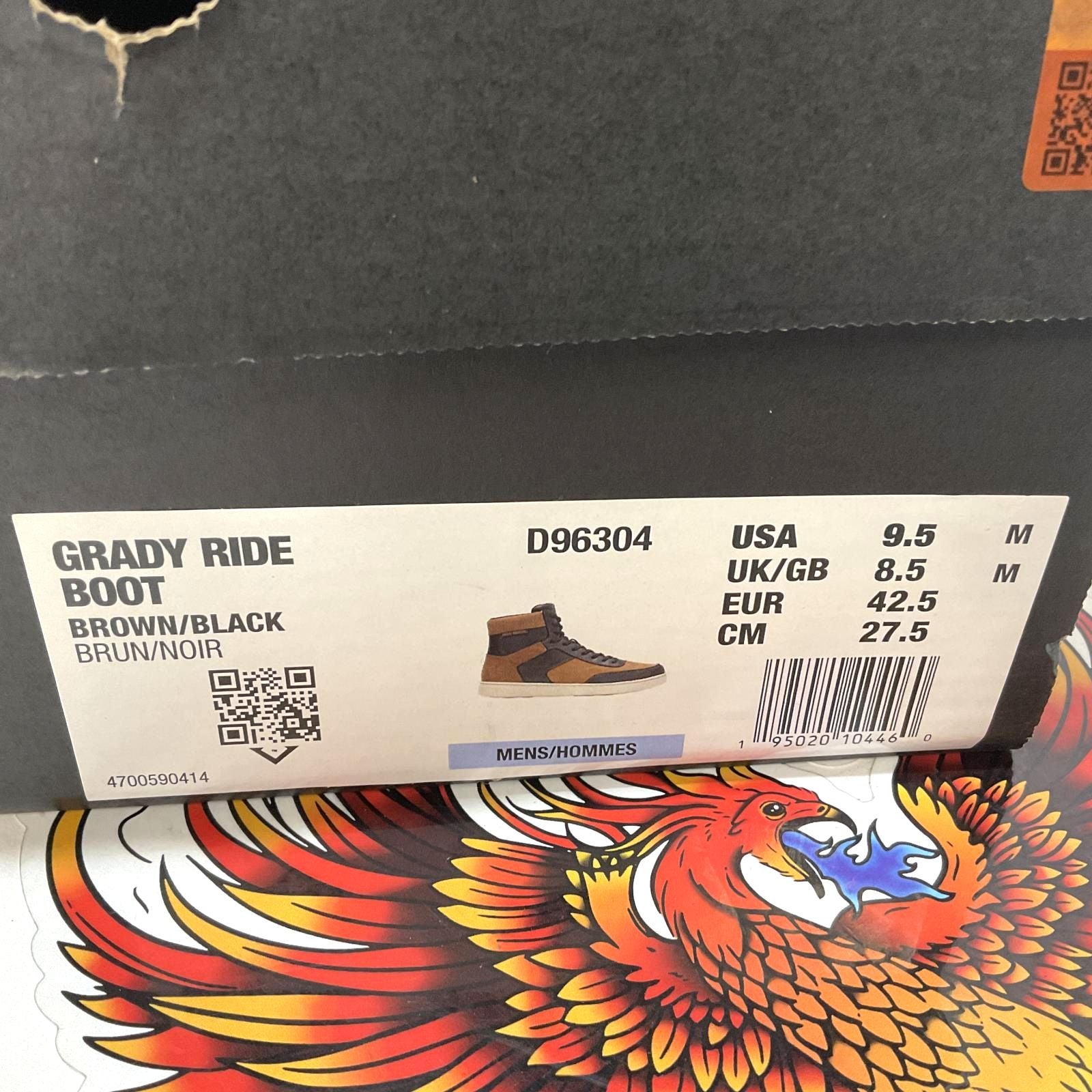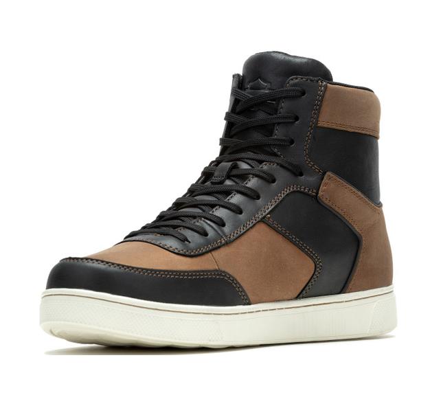 This Grady Ride performance riding sneaker comes in brown with black block colorways. Tan stitch accents pull the styling together in a beautiful way. Featuring Poron® ankle protection against extreme impacts, reflective piping, and durable full-grain leather with a rubber outsole, this model will allow you to ride all day and all night in comfort. Classically styled, this boot has a debossed Harley-Davidson® silhouette Bar & Shield® logo on the heel’s counter. A color coordinated fabric logo is also attached to the padded cuff. Another debossed silhouette Bar & Shield® is on the padded tongue. Reflective piping adds protection in low-light conditions. The rubber outsole is classic white, with another Bar & Shield® logo imbedded at the street-side instep. After the ride, with a full-length mesh lining, these boots provide the stylish comfort needed for work and for play at any venue. The fun really starts when the kickstand goes down. The boot's sole, insole and upper are bound using cement construction processes, a time honored and durable method that allows for a flexible and easy stride. Uptown, downtown, at work or play, or while riding on your motorcycle, these boots will get you there in style and comfort. Shaft height: 5.25", Heel height: 1". Sizes US: M 7-12, 13. Manufacturer Part Number, D96304. Wolverine® and Harley-Davidson® have a long tradition of bringing original and functional footwear to our motorcycle enthusiasts. Loyal. Tough. Fearless. Our Footwear embodies the spirit of the open road, as well as the men and women who proudly wear the name. With a growing global presence, Harley-Davidson® Footwear markets functional riding and fashion footwear to anyone who seeks quality and values the Harley-Davidson® brand. Whether it's performance or fashion, we have what you need. Officially Licensed Harley-Davidson® Product by Wolverine®. *Riding Appropriate – Abrasion, slip, and oil-resistant boots, ideal for riding motorcycles.