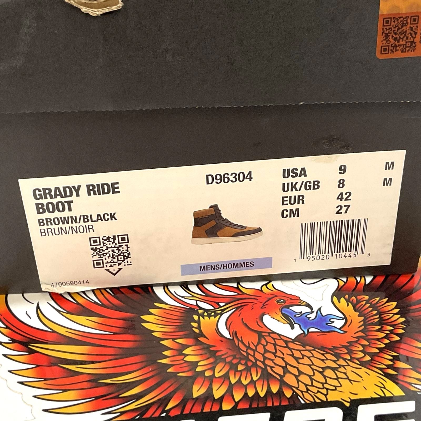 This Grady Ride performance riding sneaker comes in brown with black block colorways. Tan stitch accents pull the styling together in a beautiful way. Featuring Poron® ankle protection against extreme impacts, reflective piping, and durable full-grain leather with a rubber outsole, this model will allow you to ride all day and all night in comfort. Classically styled, this boot has a debossed Harley-Davidson® silhouette Bar & Shield® logo on the heel’s counter. A color coordinated fabric logo is also attached to the padded cuff. Another debossed silhouette Bar & Shield® is on the padded tongue. Reflective piping adds protection in low-light conditions. The rubber outsole is classic white, with another Bar & Shield® logo imbedded at the street-side instep. After the ride, with a full-length mesh lining, these boots provide the stylish comfort needed for work and for play at any venue. The fun really starts when the kickstand goes down. The boot's sole, insole and upper are bound using cement construction processes, a time honored and durable method that allows for a flexible and easy stride. Uptown, downtown, at work or play, or while riding on your motorcycle, these boots will get you there in style and comfort. Shaft height: 5.25", Heel height: 1". Sizes US: M 7-12, 13. Manufacturer Part Number, D96304. Wolverine® and Harley-Davidson® have a long tradition of bringing original and functional footwear to our motorcycle enthusiasts. Loyal. Tough. Fearless. Our Footwear embodies the spirit of the open road, as well as the men and women who proudly wear the name. With a growing global presence, Harley-Davidson® Footwear markets functional riding and fashion footwear to anyone who seeks quality and values the Harley-Davidson® brand. Whether it's performance or fashion, we have what you need. Officially Licensed Harley-Davidson® Product by Wolverine®. *Riding Appropriate – Abrasion, slip, and oil-resistant boots, ideal for riding motorcycles.