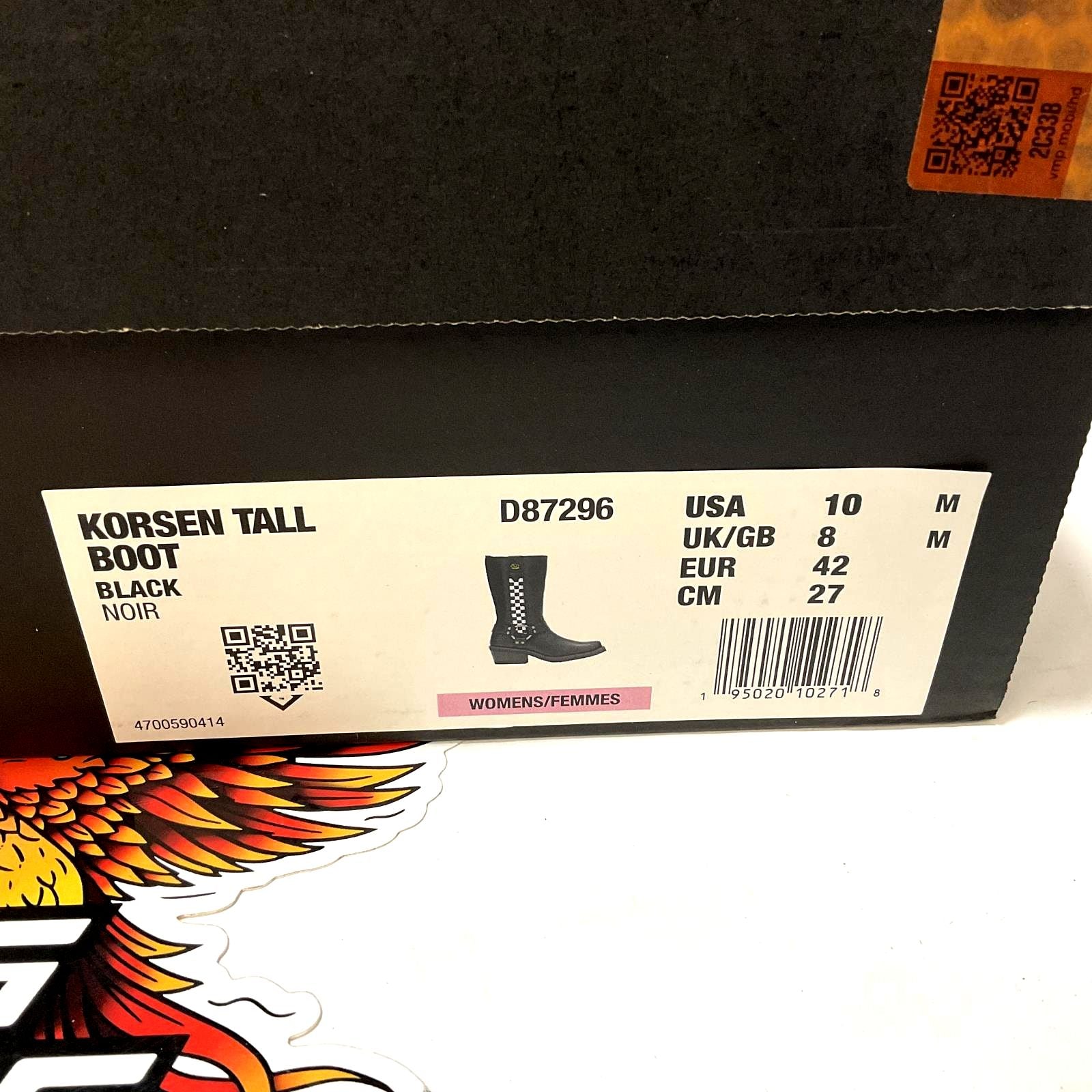 The popular Korsen Harness has been given added height and styled with a checker board stripe and flower detail - a fun addition to your everyday wardrobe. Featuring heat deflecting full-grain leather, a waterproof Breathable Hydro-Guard™ waterproof membrane lining, a rubber outsole, and an inside gore for the optimal fit, this core style is versatile in both function and style. Made with a western flair, this full-grain leather boot with its Harness detail is ideal for everyday wear - at the office, for social functions, line dancing at the club, or for everyday wear. The YKK® locking inside zipper offers the quick and secure fit that you crave. The toe is squared, invoking a little more western edge. The classic O-Ring harness style is both versatile and functional, supporting both the fore and after straps. A debossed silhouette Bar & Shield logo in on the heel’s counter. A feminine touch has been added at the top of the shaft, above the checker board stripe. The boot's sole, insole and upper are bound using cement construction processes, a time honored and durable method that allows for a flexible and easy stride. The western heel provides an ample 2.25-inch lift, and the rubber outsole means a soft landing with each step. A Bar & Shield® logo is inserted into the street side instep. Pair with jeans, dresses or middies for a modern uptown look wherever you go. Total height: 12.25", Shaft height: 10", Heel height: 2.25". Sizes US: M 5-10, 11. Manufacturer Part Number, D87296. Wolverine® and Harley-Davidson® have a long tradition of bringing original and functional footwear to our motorcycle enthusiasts. Loyal. Tough. Fearless. Our Footwear embodies the spirit of the open road, as well as the men and women who proudly wear the name. With a growing global presence, Harley-Davidson® Footwear markets functional riding and fashion footwear to anyone who seeks quality and values the Harley-Davidson® brand. Whether it's performance or fashion, we have what you need. Officially Licensed Harley-Davidson® Product by Wolverine®. These boots are not appropriate for wear while riding a motorcycle.