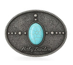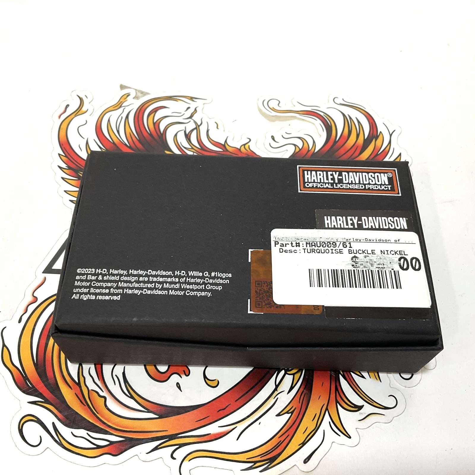 Harley-Davidson® Women's Turquoise Stone Belt Buckle, MAU009/61. Turn heads with this beautiful belt buckle. Stunning turquoise stone accented with raised domes and H-D® script raised logo. High-quality heavy-duty belt buckle in a gorgeous antique nickel finish. Size: 3.25" x 2.5". Fits up to 38mm wide strap. Wear this stunning belt buckle for instant style and love.