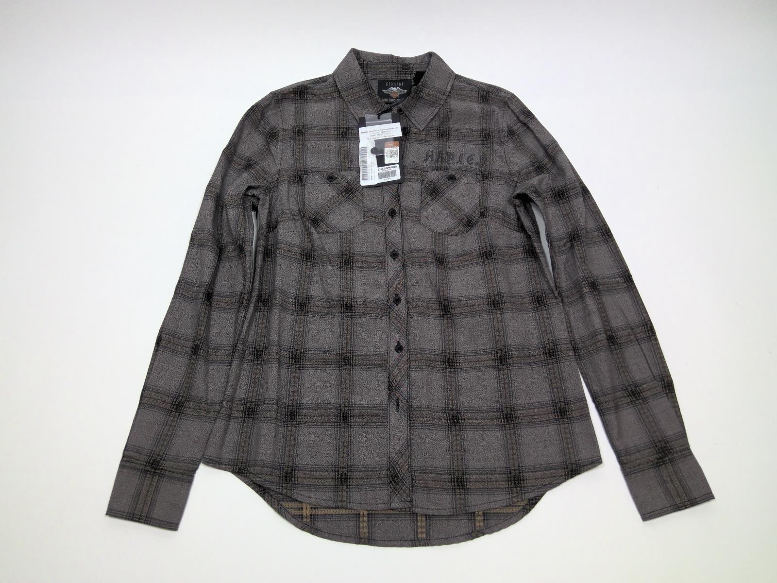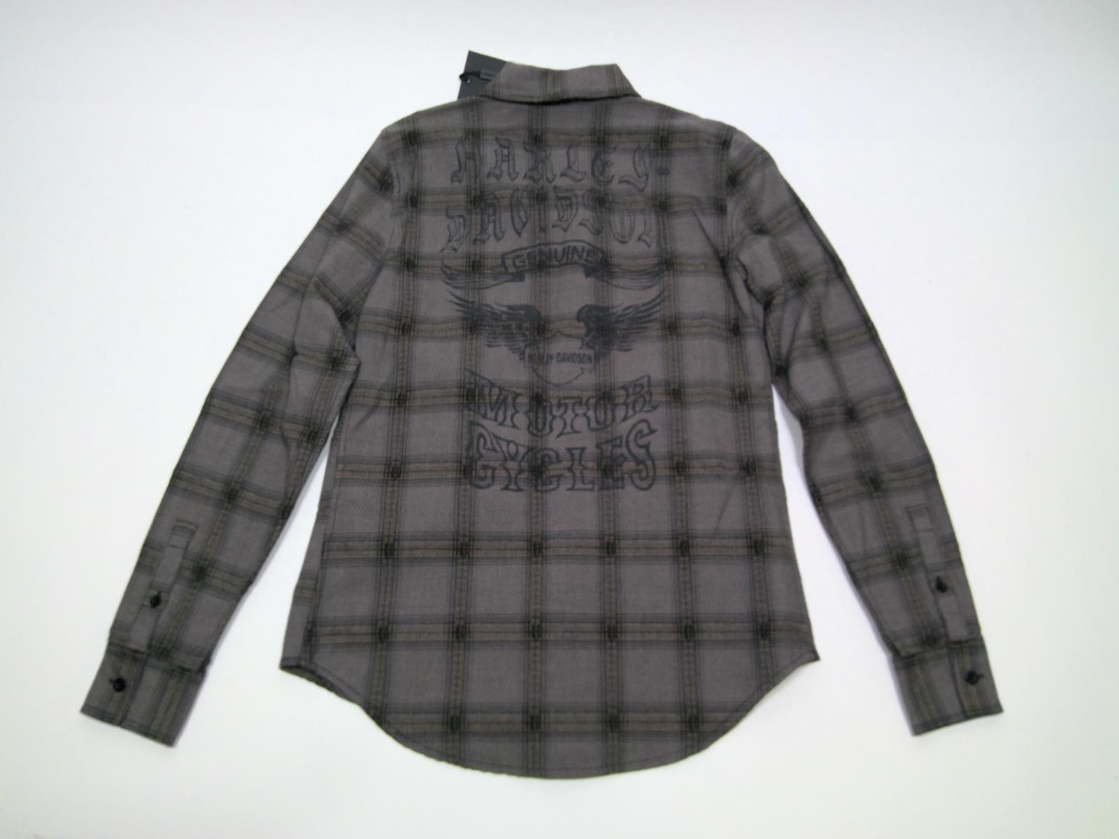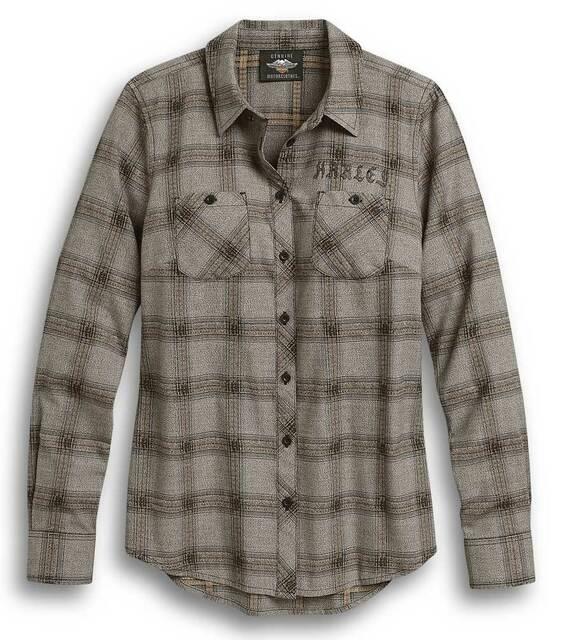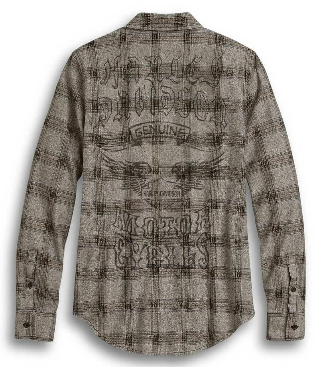 Harley-Davidson® Women's Genuine Winged Logo Plaid Long Sleeve Shirt, 96314-20VW. Made from 100% cotton dobby twisted and yarn-dyed plaid that is washed for softness. Snap-down collar. Button front and cuffs. Button chest pockets. Printed graphics. The dramatic moody Gothic graphic pairs great with black denim. 96314-20VW