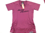 Harley-Davidson Womens Short sleeve scoop neck stretch synthetic tee with wicking, ruching and drop-tail hem.