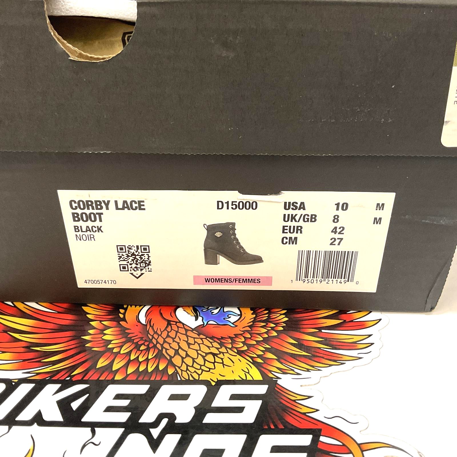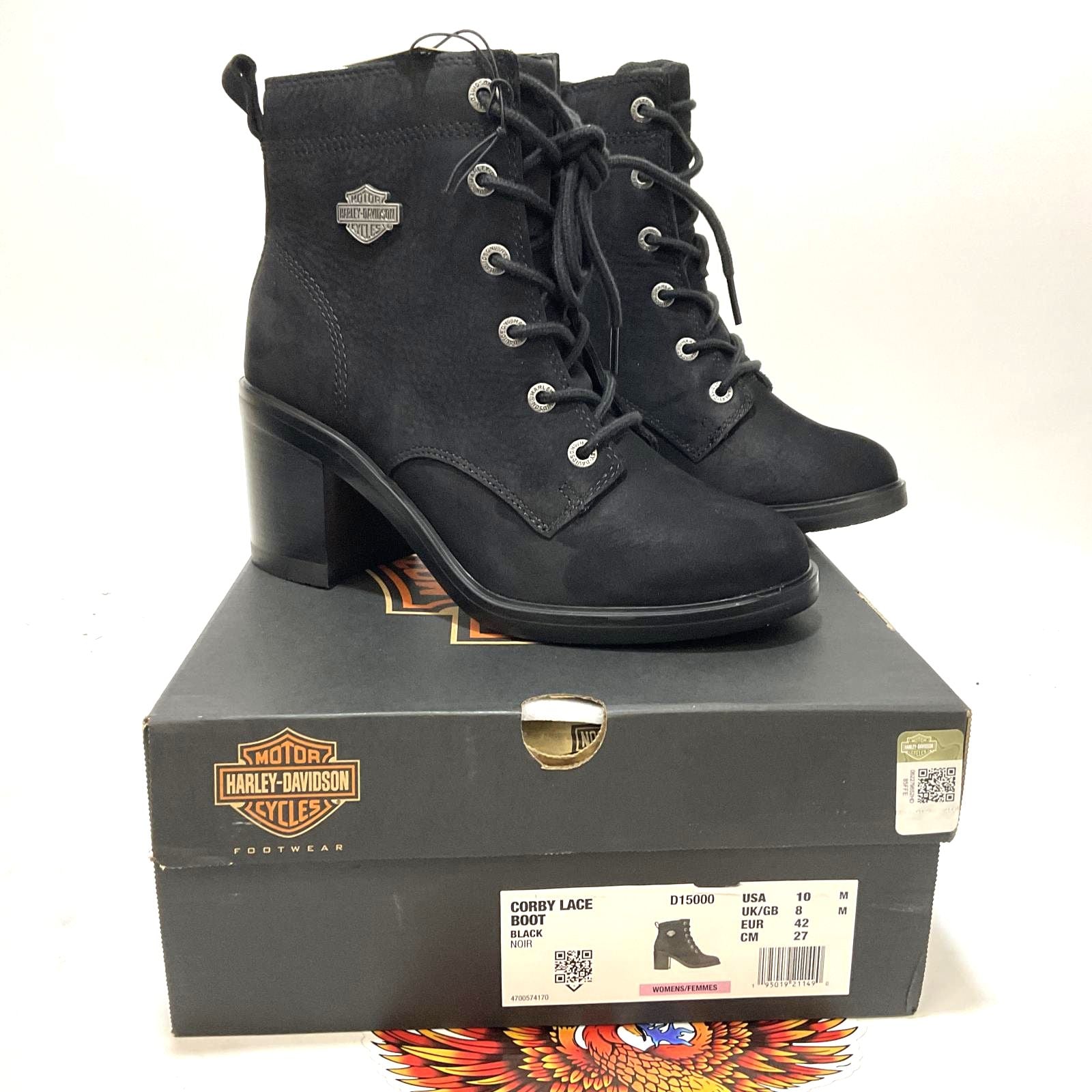 These boots are the perfect style to transform your look from daytime to nighttime city-lights bright. The Corby is a dress-up boot with tonal laces and antiqued metal hardware. The 3-inch heel lifts the full-grain leather uppers to a perfect height for the styling you want under the night-lights of the city. A full-length mesh lining means hours of comfort. The leather has a slight texture that is pleasing to the eye and touch. Don't waste time with lacing - the YKK® locking inside zippers makes it easy to pull-on or kick-off. The toe is rounded. The tonal laces are supported by logo metal eyelets that provide the perfect contrast of color. The tongue is padded and sports a debossed Harley-Davidson® Bar & Shield® logo. A metal Bar & Shield® logo is affixed near the top of the shaft. The heel is blocked and a pull-on strap at the top of the shaft assists in donning. Step-in, zip-up, and you are ready for the office or a night on-the-town. The boot's sole, insole and upper are bound using cement construction processes, a time honored and durable method that allows for a flexible and easy stride. Pair with color coordinated brightly printed blouses tucked into high-rise flared skirts, with jeans, cropped trousers, or slip dresses. For a sporty look, go for a white tee-shirt with a skirt. Total height: 7.5", Shaft height: 4.5", Heel height: 3". Sizes US: M 5-10, 11. Manufacturer Part Number, Black-D15000, Brown-D15001. Wolverine® and Harley-Davidson® have a long tradition of bringing original and functional footwear to our motorcycle enthusiasts. Loyal. Tough. Fearless. Our Footwear embodies the spirit of the open road, as well as the men and women who proudly wear the name. With a growing global presence, Harley-Davidson® Footwear markets functional riding and fashion footwear to anyone who seeks quality and values the Harley-Davidson® brand. Whether it's performance or fashion, we have what you need. Officially Licensed Harley-Davidson® Product by Wolverine®. These boots are not appropriate for wear while riding a motorcycle.