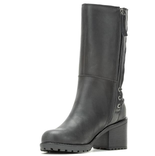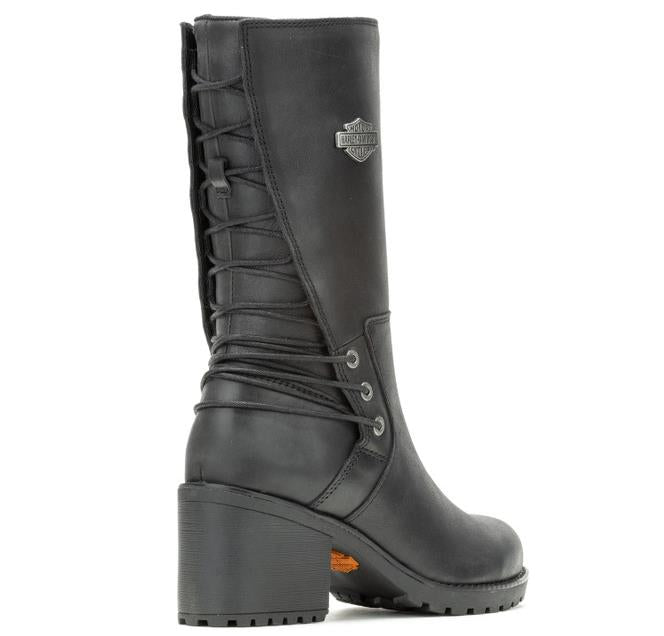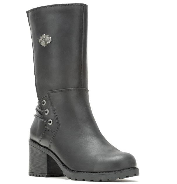 Harley-Davidson® Women's Aldona 9.75-Inch Black or Tan Fashion Boots, Black-D87268, Tan- D87269. Don’t be surprised if everyone stops talking when you walk into a room with these showstopper boots. Satisfy your inner rebel with the Aldona 9.75-inch leather boot. Featuring a YKK® locking inside zipper and adjustable back lace for a custom fit, just lace-up and go – you are now legend! The boot is made with full-grain leather with a full-length mesh lining, and sits on a beautiful 2.75-inch block heel for a 12.5-inch total lift. The full-length zipper comes equipped with a pull-tab for easy donning. Snug up the adjustable backside laces, and you are away. The rubber outsole silhouette Bar & Shield® tread elements provide for a sure-footing with every step. The toe is round, and the vamp and front shaft are clean and smooth. A metal Bar & Shield® badge graces the outside face of the shaft. The street side sole also has a Harley® orange Bar & Shield® at the instep. The boot's sole, insole and upper are bound using cement construction processes, a time honored and durable method that allows for a flexible and easy stride. Pair with jeans, or skinnies for a casual look; for dress-up, pair with skinny trousers, skirts, and dresses. Total height: 12.5", Shaft height: 9.75", Heel height: 2.75". Sizes US: M 5-10, 11. Manufacturer Part Number, Black-D87268, Tan-D87269. Wolverine® and Harley-Davidson® have a long tradition of bringing original and functional footwear to our motorcycle enthusiasts. Loyal. Tough. Fearless. Our Footwear embodies the spirit of the open road, as well as the men and women who proudly wear the name. With a growing global presence, Harley-Davidson® Footwear markets functional riding and fashion footwear to anyone who seeks quality and values the Harley-Davidson® brand. Whether it's performance or fashion, we have what you need. Officially Licensed Harley-Davidson® Product by Wolverine®. These boots are not appropriate for wear while riding a motorcycle.