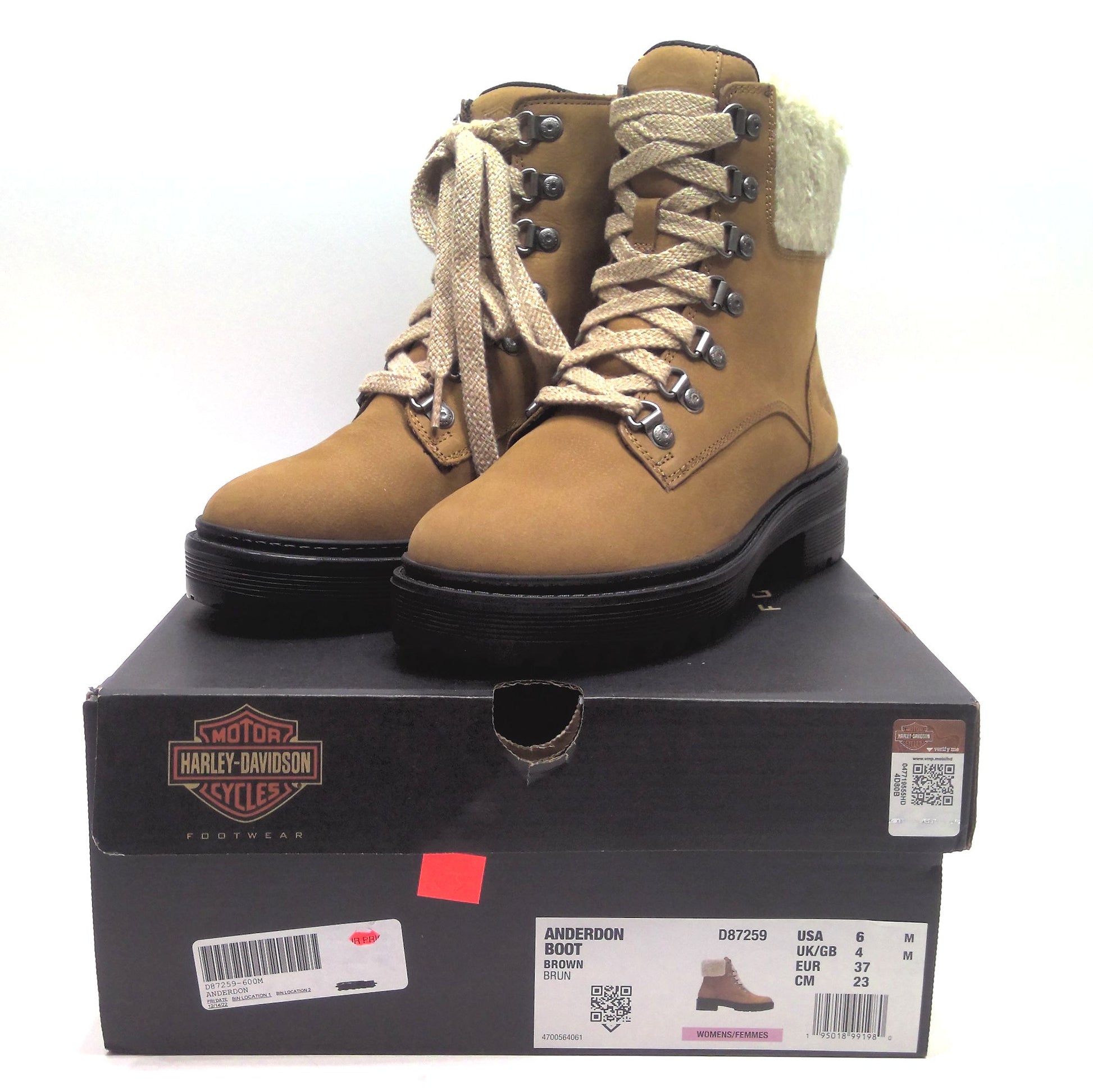 Harley-Davidson® Women's Anderdon Riding Appropriate* 6-Inch Black or Brown Motorcycle Boots, Black-D87258, Brown, D87259. Step out in style. The Anderdon features full-grain Nubuck leather for a slight velvet-like finish, topped with a color-coordinated cozy faux-fur collar. Color-coordinated laces with D-Rings and YKK® locking inside zippers for easy-on/off, makes this styling unique – they will not disappoint. The toe is rounded and a Bar & Shield® logo is debossed into the padded tongue and into the outside face of the heel’s counter. The padded tongue and a full-length mush lining will add hours of comfort while riding or walking. The heel and outsole are lightweight, and the heel has a comfortable and stylish 1.75-inch lift. The street-side outsole has a signature Harley-Davidson® logo at the instep. The boot's sole, insole and upper are bound using cement construction processes, a time honored and durable method that allows for a flexible and easy stride. Pair with jeans, dresses or middies for an uptown look wherever you go. Total height: 7.75", Shaft height: 6", Heel height: 1.75". Sizes US: M 5-10, 11. Manufacturer Part Number, Black-D87258, Brown-D87259. Wolverine® and Harley-Davidson® have a long tradition of bringing original and functional footwear to our motorcycle enthusiasts. Loyal. Tough. Fearless. Our Footwear embodies the spirit of the open road, as well as the men and women who proudly wear the name. With a growing global presence, Harley-Davidson® Footwear markets functional riding and fashion footwear to anyone who seeks quality and values the Harley-Davidson® brand. Whether it's performance or fashion, we have what you need. Officially Licensed Harley-Davidson® Product by Wolverine®. *Riding Appropriate – Abrasion, slip, and oil-resistant boots, ideal for riding motorcycles.