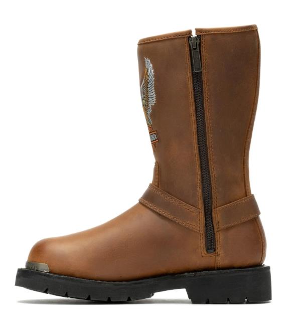 Authentic to the last stitch. The Corley is a standout with eagle embroidery, buckles, a harness O-Ring, and metal plate logo detailing on the toe and the heel. The boots are designed with full-grain leather uppers, a full-length mesh lining, and a rubber outsole. The eyes are immediate drawn to the colorful Harley-Davidson® Eagle logo, placed front and center on the boot’s shaft. The toe is rounded, and the vamp features a classic harness cross strap and logo buckle. Logo buckles adorn the shaft, allowing for a custom comfort fit. With the YKK® locking inside zippers, just step-in, zip-up and you are out the door. The outsole is made of grippy rubber, with a classic orange Bar & Shield® logo inserted at the street-side in-step. Additional orange tread elements are fitted at the front and on the heel. The boot's sole, insole and upper are bound using Goodyear® Welt construction, completing the boot with trusted durability. The Corley has everything H-D® you crave packed into one boot. Total height: 11.5", Shaft height: 10", Heel height: 1.5". Sizes US: M 5-10, 11. Manufacturer Part Number, D87305, D87306. Wolverine® and Harley-Davidson® have a long tradition of bringing original and functional footwear to our Motorcycle enthusiasts. Loyal. Tough. Fearless. Our Footwear embodies the spirit of the open road, as well as the men and women who proudly wear the name. With a growing global presence, Harley-Davidson® Footwear markets functional riding and Motorcycle footwear to anyone who seeks quality and values the Harley-Davidson® brand. Whether it's performance or Motorcycle, we have what you need. Officially Licensed Harley-Davidson® Product by Wolverine®. These boots are not recommended for riding on a motorcycle.