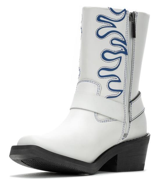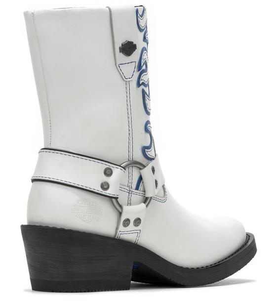 Harley-Davidson® Riding Appropriate* Women's Korsen 8-Inch White Motorcycle Harness Boots, D87293. The popular Korsen Harness has been styled with a blue flame accent. A fun addition to your H-D® wardrobe, featuring easy to clean full-grain leather, a full-length mesh lining, premium D30® ankle protection, reflective piping and a rubber outsole. This core style is versatile in both function, and style. Made with a western flair, this full-grain leather boot with its Harness detail is ideal on a motorcycle, as well as for everyday wear - at the office, for social functions, line dancing at the club, or for everyday wear around town. The D3O® Fitted Ankle Guard offers increased protection and comfort with its ergonomic shape and tapered profile. Reflective piping provides increased visibility while riding low-light conditions. The YKK® locking inside zipper offers the quick and secure fit that you crave. The toe is squared, invoking a western edginess. The classic O-Ring harness style is both versatile and functional, supporting both the fore and after straps. A debossed Bar & Shield logo in on the heel’s counter. A subtle Bar & Shield® metal badge adorns the pull-on strap at the top of the shaft. The boot's sole, insole and upper are bound using cement construction processes, a time honored and durable method that allows for a flexible and easy stride. The western heel provides an ample 2.25-inch lift, and the rubber outsole means a soft landing with each step. A blue Bar & Shield® logo is inserted into the street side instep. Pair with jeans, dresses or middies for a modern uptown look. Worn with jackets accented in blue is a show stopper. Total height: 8", Shaft height: 5.75-In, Heel height: 2.25". Sizes US: M 5-10, 11. Manufacturer Part Number, D87293. Wolverine® and Harley-Davidson® have a long tradition of bringing original and functional footwear to our motorcycle enthusiasts. Loyal. Tough. Fearless. Our Footwear embodies the spirit of the open road, as well as the men and women who proudly wear the name. With a growing global presence, Harley-Davidson® Footwear markets functional riding and fashion footwear to anyone who seeks quality and values the Harley-Davidson® brand. Whether it's performance or fashion, we have what you need. Officially Licensed Harley-Davidson® Product by Wolverine®. *Riding Appropriate – Abrasion, slip, and oil-resistant boots, ideal for riding motorcycles.
