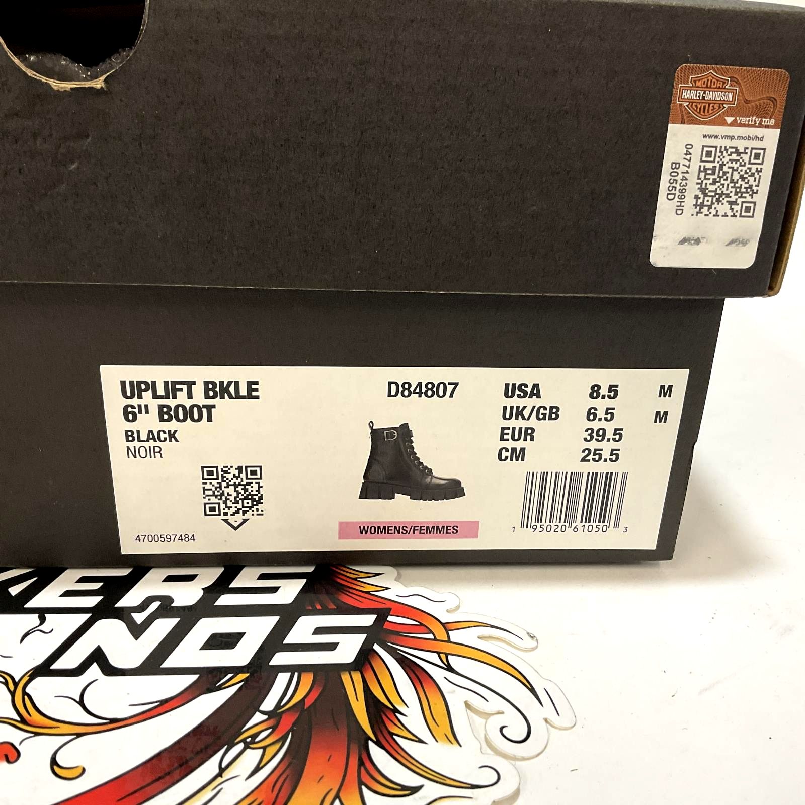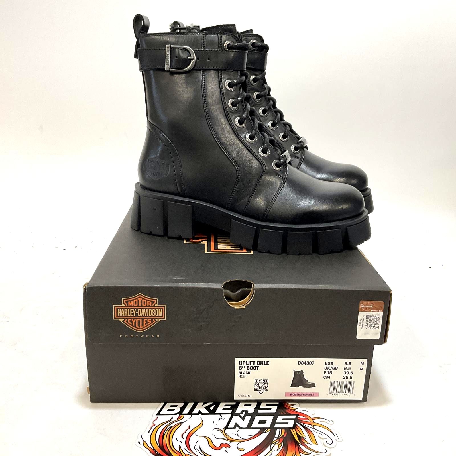 These Uplift Buckle boots are right-on-trend with the moto boot fashion craze – no matter where they take you, heads will turn. The sleek all-black look with a top buckle and an over emphasized outsole is perfect for day-to-night looks. Feel powerful and confident with these always in-style boots. A smooth rounded toe leads up to metal logo eyelets with cord likening. A metal Harley-Davidson® badge marks the bottom lace. After stepping-in and zipping-up using the YKK® locking inside zippers, secure your fit using the top strap with logo buckle. Made with full-grain leather with a full-length mesh lining for total comfort, you are ready for anything. A debossed Bar & Shield® logo has been pressed into the outside facing heel counter. Lightweight outsoles and heels make each step seem effortless. The boot's sole, insole and upper are bound using cement construction processes, a time honored and durable method that allows for a flexible and easy stride. Adding to the 6-inch shaft, the gentle 1.75-inch heel adds the perfect lift. Another Harley® logo can be found on the street-side instep. For work or play, no matter the activity, these boots will turn heads, and in a good way. Total height: 7.75”, Shaft height: 6", Heel height: 1.75". Sizes US: M 5-10. Manufacturer Part Number D84807. Wolverine® and Harley-Davidson® have a long tradition of bringing original and functional footwear to our Motorcycle enthusiasts. Loyal. Tough. Fearless. Our Footwear embodies the spirit of the open road, as well as the men and women who proudly wear the name. With a growing global presence, Harley-Davidson® Footwear markets functional riding and Motorcycle footwear to anyone who seeks quality and values the Harley-Davidson® brand. Whether it's performance or Motorcycle, we have what you need. Officially Licensed Harley-Davidson® Product by Wolverine®.