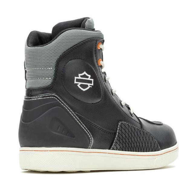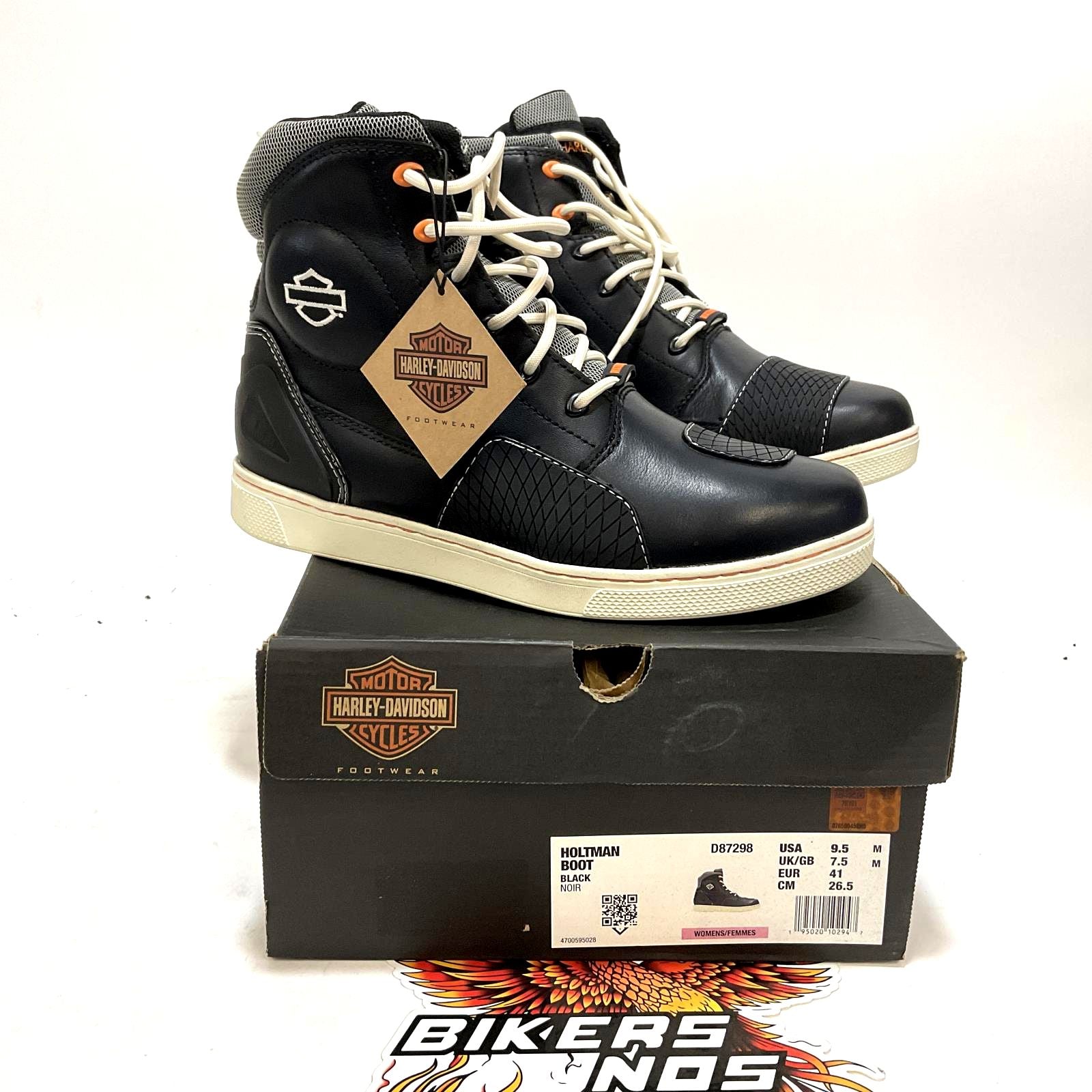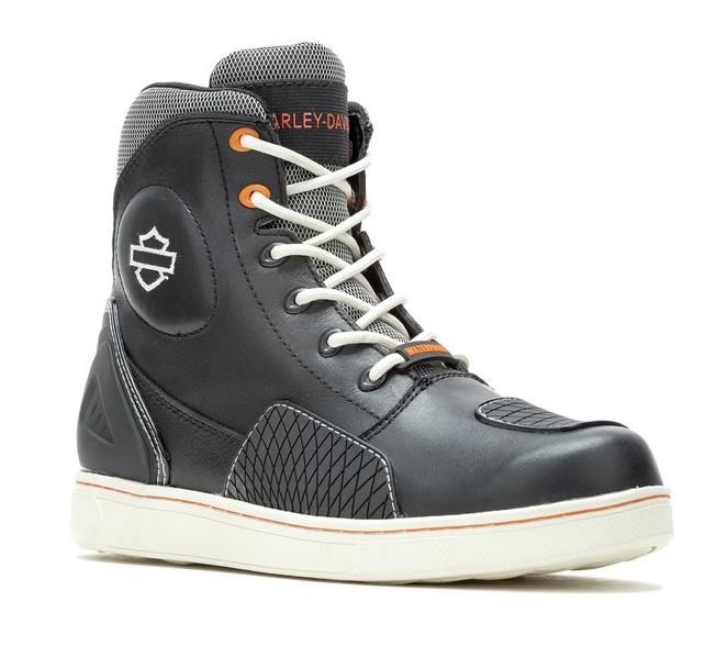 Harley-Davidson® Women’s Riding Appropriate* Holtman 5.5-Inch Black Waterproof Motorcycle Boots, D87298. Be street-right and road-ready with the Holtman waterproof performance riding sneaker boots. These boots are designed with heat-resistant leather uppers, along with ankle protection and abrasion resistant overlays for added durability. The boots feature a pop of orange with white stitching to complete your look. The uppers are made with waterproof full-grain leather, and the lining has a breathable Hydro-Guard™ waterproof membrane to keep your feet dry in all-weather conditions. Abrasion resistant finemould panels are placed where it matters most. The toe is round. White cord lacing compliments the white stitching. A waterproof badge is on the bottom lace as a reminder that you ready no matter the weather. Extra ankle padding covers the ankles, with an embroidered Harley-Davidson® silhouette logo. Extra layers of leather are placed on the heel, leading up to a padded cuff and tongue. The outsole is white with a line of orange that ties the orange colors beautifully. The street-side outsole has a bold Harley Bar & Shield® logo inserted at the instep. The boot's sole, insole and upper are bound using time honored cement construction processes, completing the boot with trusted durability. If you’re looking for a go-anywhere at any time boot, this one is the answer. Total height: 6.5"; Shaft height: 5.5", Heel height: 1.0". Sizes US: M 5-10, 11. Manufacturer Part Number, D87298. Wolverine® and Harley-Davidson® have a long tradition of bringing original and functional footwear to our Motorcycle Lace-Up enthusiasts. Loyal. Tough. Fearless. Our Footwear embodies the spirit of the open road, as well as the men and women who proudly wear the name. With a growing global presence, Harley-Davidson® Footwear markets functional riding and fashion footwear to anyone who seeks quality and values the Harley-Davidson® brand. Whether it's performance or fashion, we have what you need. Officially Licensed Harley-Davidson® Product by Wolverine®. *Riding Appropriate – Abrasion, slip, and oil-resistant boots, ideal for riding motorcycles.