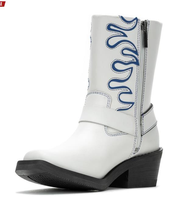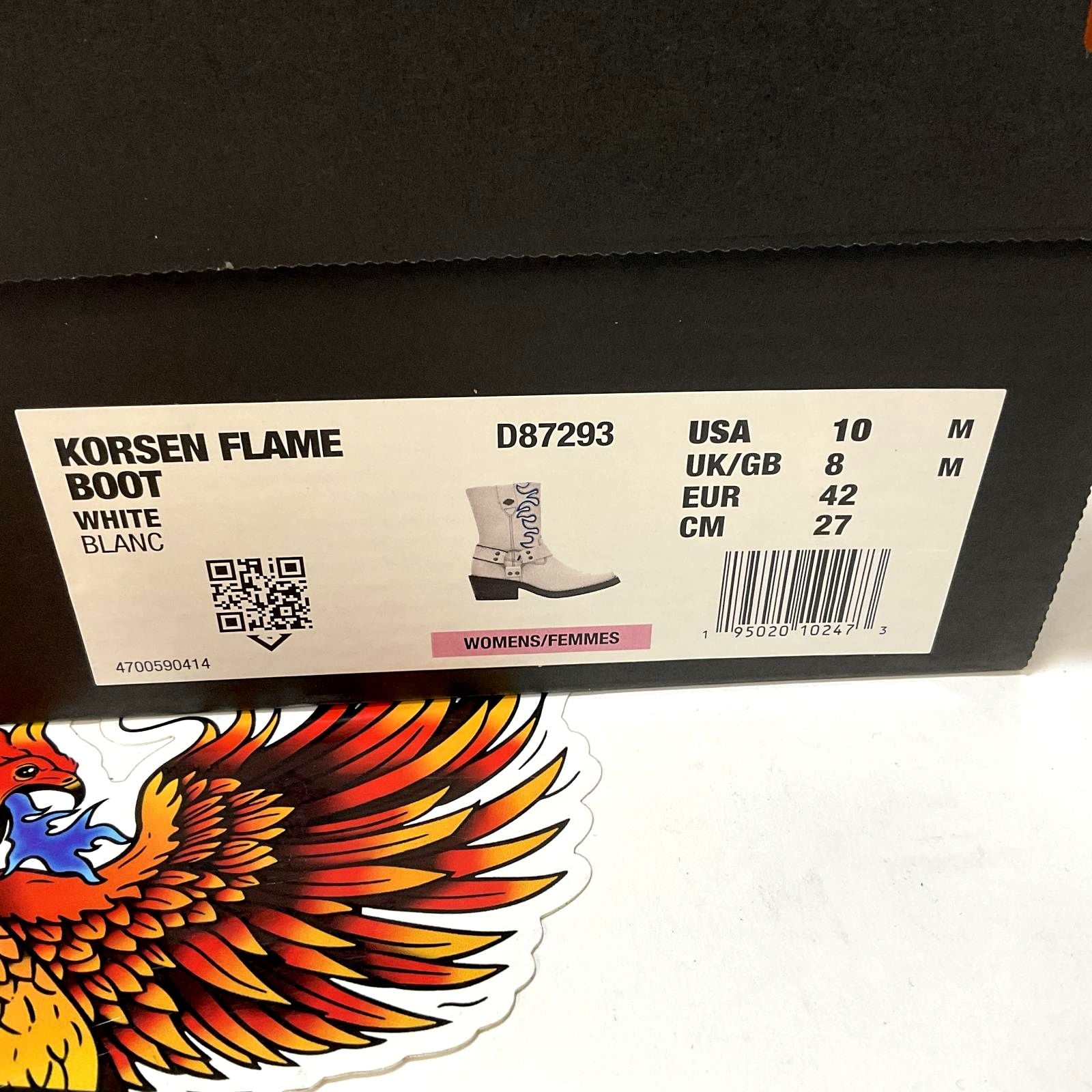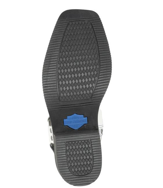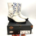 Harley-Davidson® Riding Appropriate* Women's Korsen 8-Inch White Motorcycle Harness Boots, D87293. The popular Korsen Harness has been styled with a blue flame accent. A fun addition to your H-D® wardrobe, featuring easy to clean full-grain leather, a full-length mesh lining, premium D30® ankle protection, reflective piping and a rubber outsole. This core style is versatile in both function, and style. Made with a western flair, this full-grain leather boot with its Harness detail is ideal on a motorcycle, as well as for everyday wear - at the office, for social functions, line dancing at the club, or for everyday wear around town. The D3O® Fitted Ankle Guard offers increased protection and comfort with its ergonomic shape and tapered profile. Reflective piping provides increased visibility while riding low-light conditions. The YKK® locking inside zipper offers the quick and secure fit that you crave. The toe is squared, invoking a western edginess. The classic O-Ring harness style is both versatile and functional, supporting both the fore and after straps. A debossed Bar & Shield logo in on the heel’s counter. A subtle Bar & Shield® metal badge adorns the pull-on strap at the top of the shaft. The boot's sole, insole and upper are bound using cement construction processes, a time honored and durable method that allows for a flexible and easy stride. The western heel provides an ample 2.25-inch lift, and the rubber outsole means a soft landing with each step. A blue Bar & Shield® logo is inserted into the street side instep. Pair with jeans, dresses or middies for a modern uptown look. Worn with jackets accented in blue is a show stopper. Total height: 8", Shaft height: 5.75-In, Heel height: 2.25". Sizes US: M 5-10, 11. Manufacturer Part Number, D87293. Wolverine® and Harley-Davidson® have a long tradition of bringing original and functional footwear to our motorcycle enthusiasts. Loyal. Tough. Fearless. Our Footwear embodies the spirit of the open road, as well as the men and women who proudly wear the name. With a growing global presence, Harley-Davidson® Footwear markets functional riding and fashion footwear to anyone who seeks quality and values the Harley-Davidson® brand. Whether it's performance or fashion, we have what you need. Officially Licensed Harley-Davidson® Product by Wolverine®. *Riding Appropriate – Abrasion, slip, and oil-resistant boots, ideal for riding motorcycles.