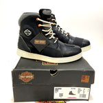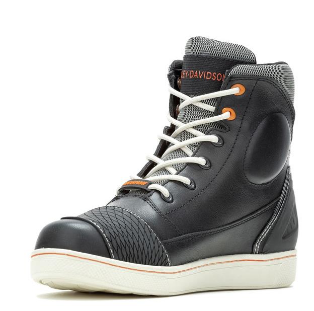 Harley-Davidson® Women’s Riding Appropriate* Holtman 5.5-Inch Black Waterproof Motorcycle Boots, D87298. Be street-right and road-ready with the Holtman waterproof performance riding sneaker boots. These boots are designed with heat-resistant leather uppers, along with ankle protection and abrasion resistant overlays for added durability. The boots feature a pop of orange with white stitching to complete your look. The uppers are made with waterproof full-grain leather, and the lining has a breathable Hydro-Guard™ waterproof membrane to keep your feet dry in all-weather conditions. Abrasion resistant finemould panels are placed where it matters most. The toe is round. White cord lacing compliments the white stitching. A waterproof badge is on the bottom lace as a reminder that you ready no matter the weather. Extra ankle padding covers the ankles, with an embroidered Harley-Davidson® silhouette logo. Extra layers of leather are placed on the heel, leading up to a padded cuff and tongue. The outsole is white with a line of orange that ties the orange colors beautifully. The street-side outsole has a bold Harley Bar & Shield® logo inserted at the instep. The boot's sole, insole and upper are bound using time honored cement construction processes, completing the boot with trusted durability. If you’re looking for a go-anywhere at any time boot, this one is the answer. Total height: 6.5"; Shaft height: 5.5", Heel height: 1.0". Sizes US: M 5-10, 11. Manufacturer Part Number, D87298. Wolverine® and Harley-Davidson® have a long tradition of bringing original and functional footwear to our Motorcycle Lace-Up enthusiasts. Loyal. Tough. Fearless. Our Footwear embodies the spirit of the open road, as well as the men and women who proudly wear the name. With a growing global presence, Harley-Davidson® Footwear markets functional riding and fashion footwear to anyone who seeks quality and values the Harley-Davidson® brand. Whether it's performance or fashion, we have what you need. Officially Licensed Harley-Davidson® Product by Wolverine®. *Riding Appropriate – Abrasion, slip, and oil-resistant boots, ideal for riding motorcycles.