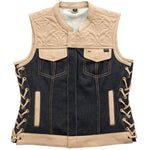 Part# L010-M - NEW MFG First Womans Light Tan Leather & Denim Vest Medium