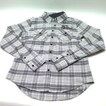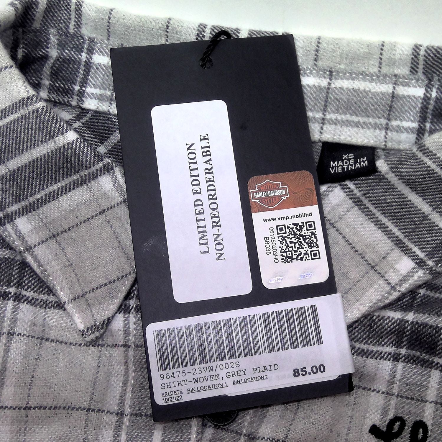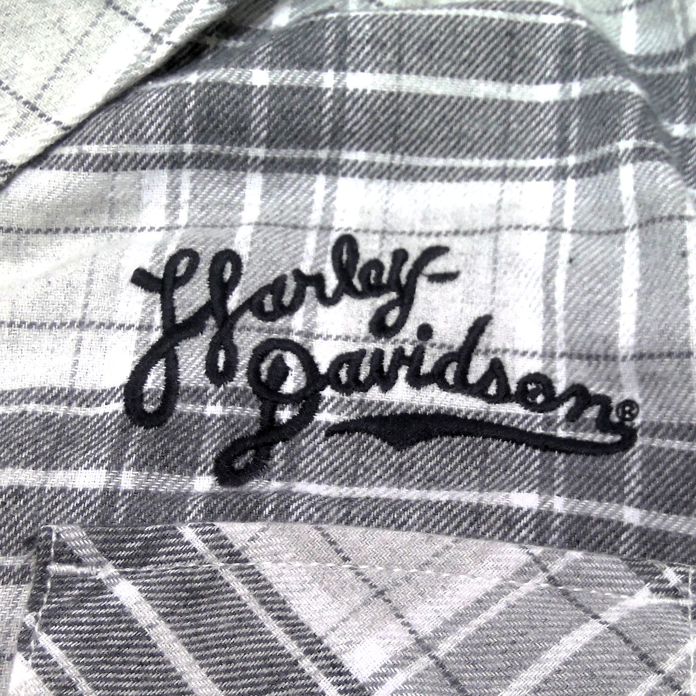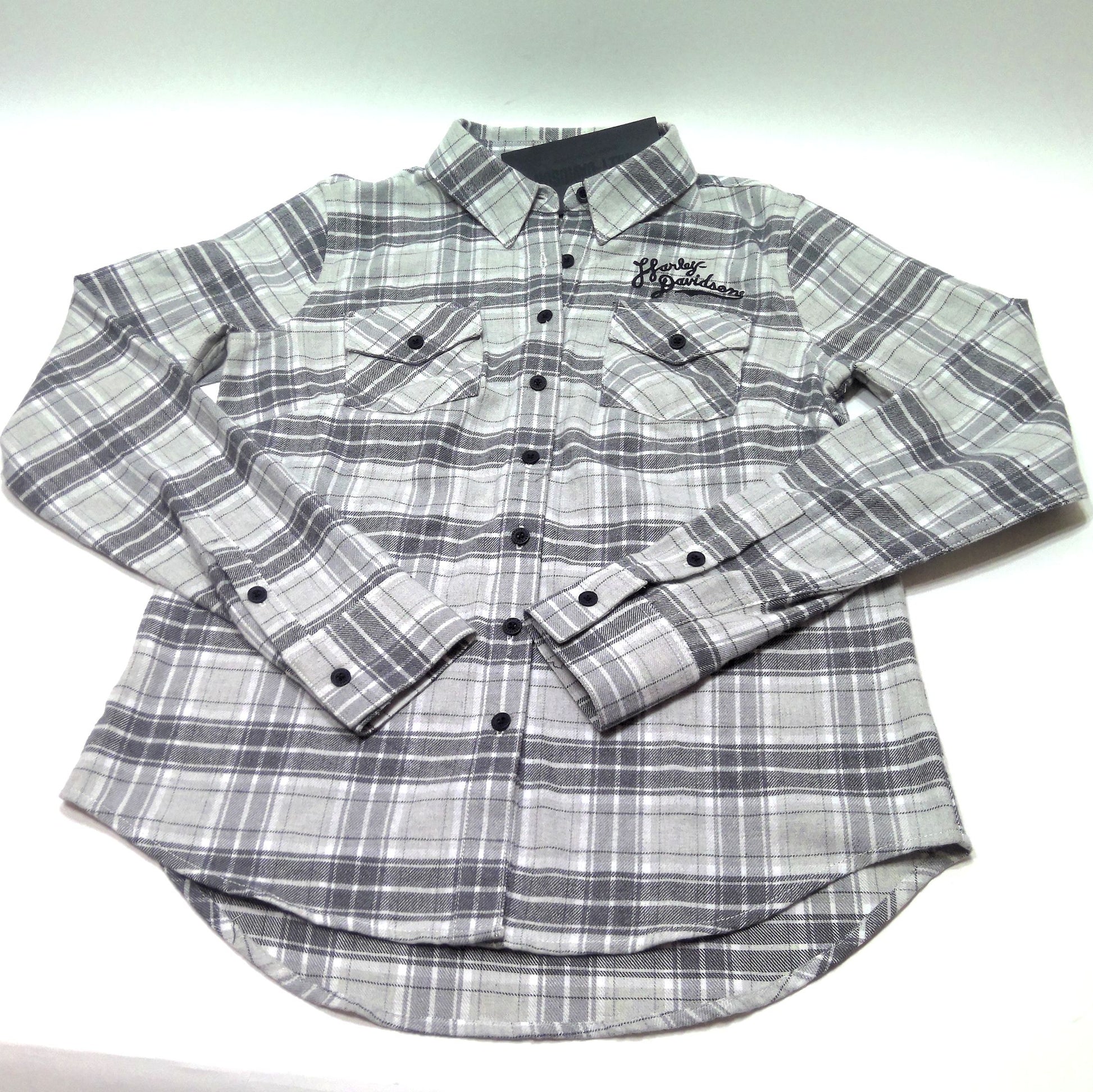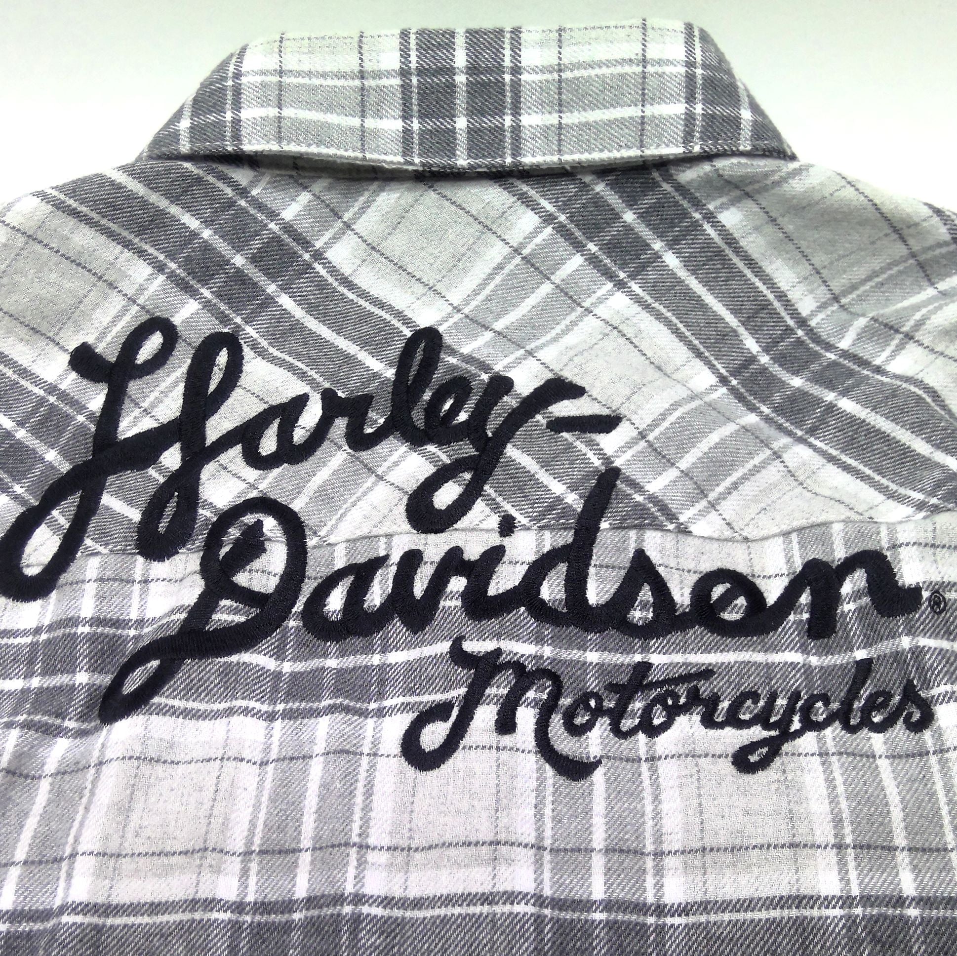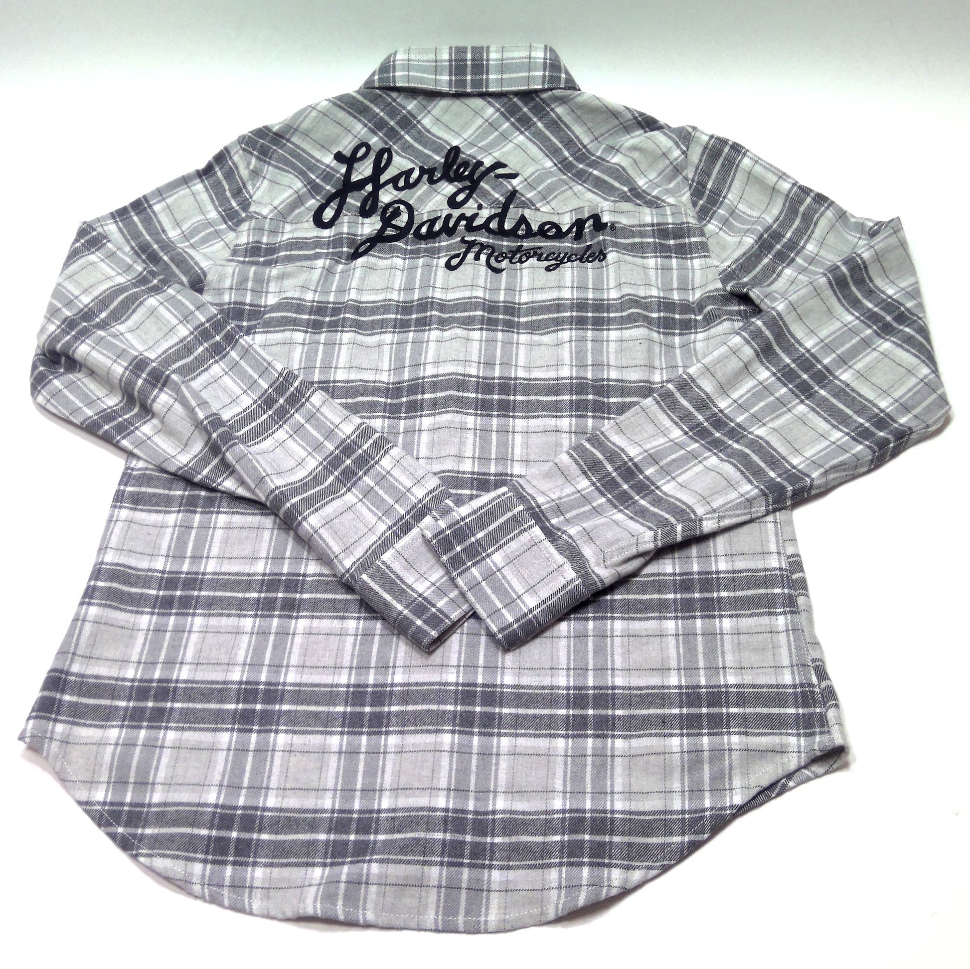 Harley-Davidson® Women's Retro Script Font Flannel Plaid Shirt, 96475-23VW. Made from 100% brushed cotton twill plaid. Button front and cuffs. Button-flap chest pockets. Hidden snap-down collar. Direct embroidery. 96475-23VW